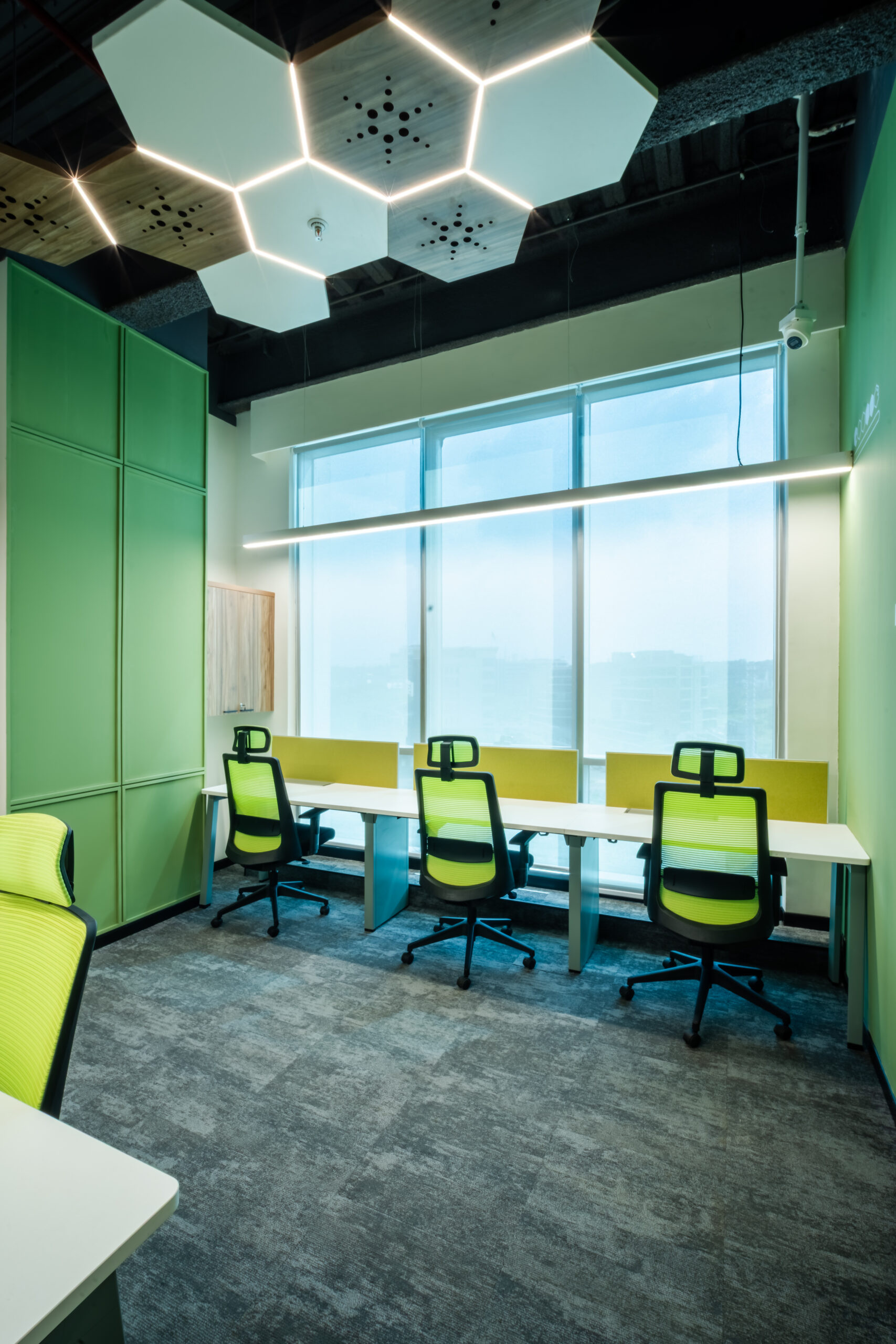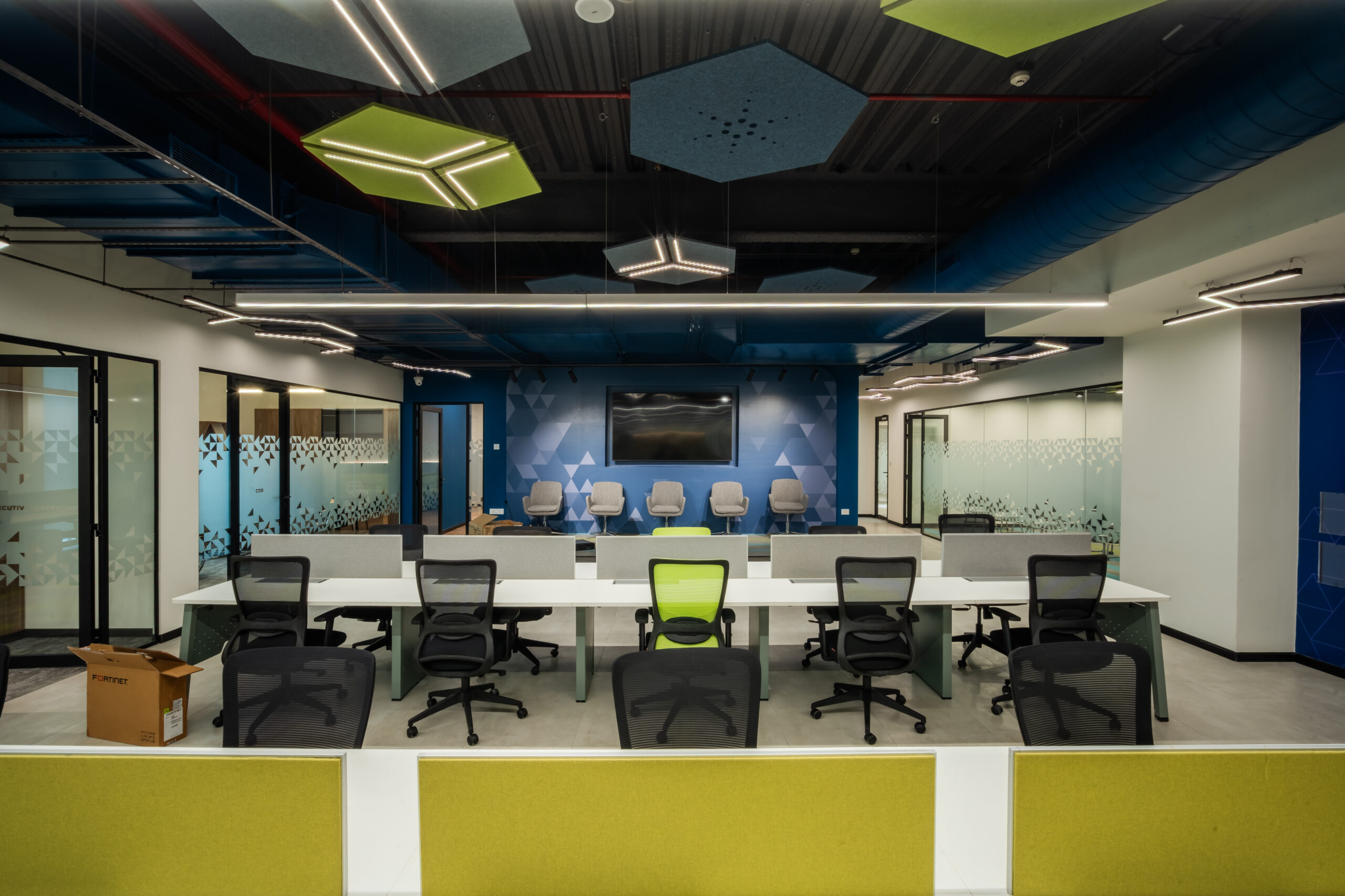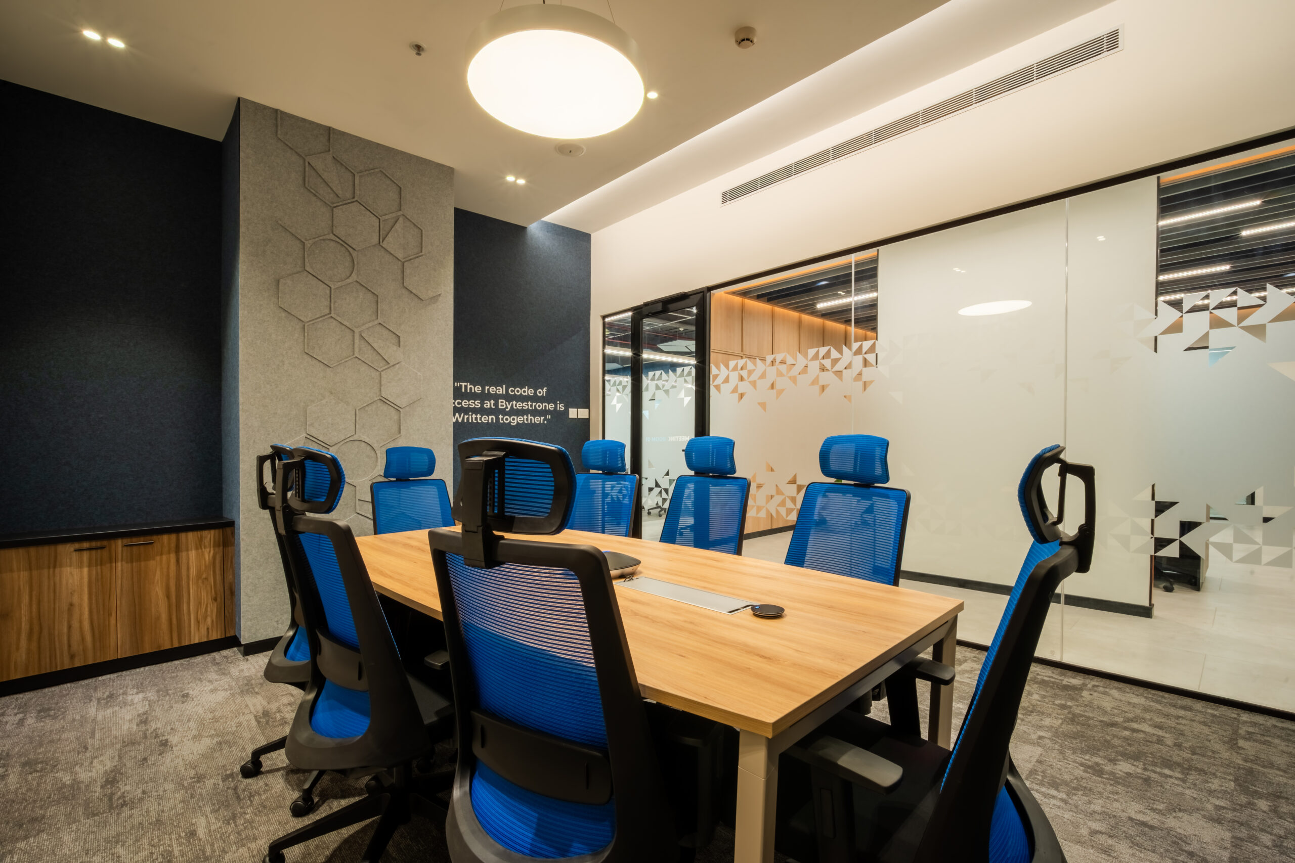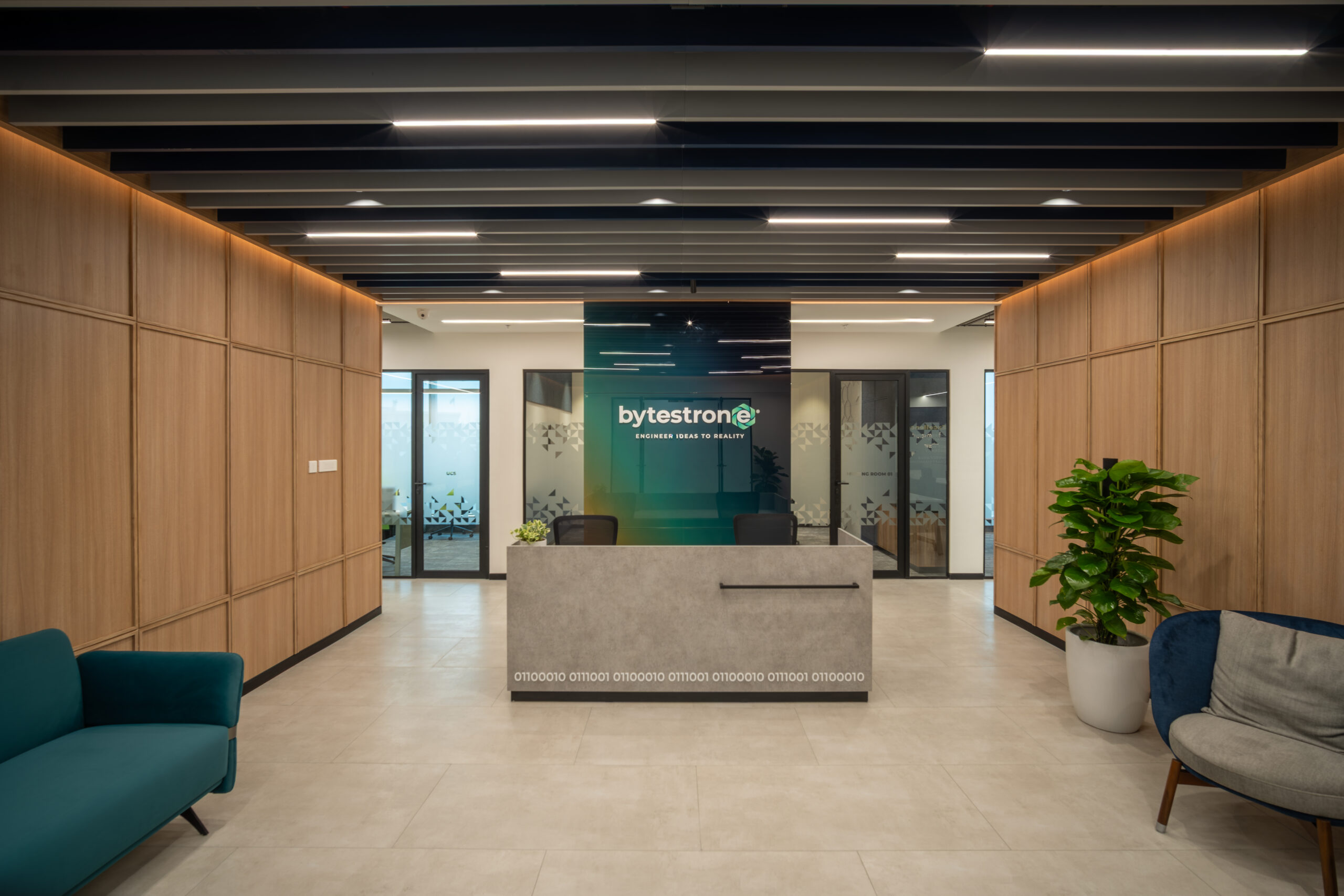 Hexagonal forms, along with the brand’s signature bright green and blue, are expressed across the office through custom hexagonal light fixtures, acoustic panels, wall paneling, branding stickers, and wall decals. The hexagon is intentionally broken, reassembled, and combined in varied configurations across different spaces to avoid monotony, while consistently reinforcing the core brand value. The result is a bold, cohesive workspace that reflects Bytestrone’s identity—where branding, engineering precision, and spatial design come