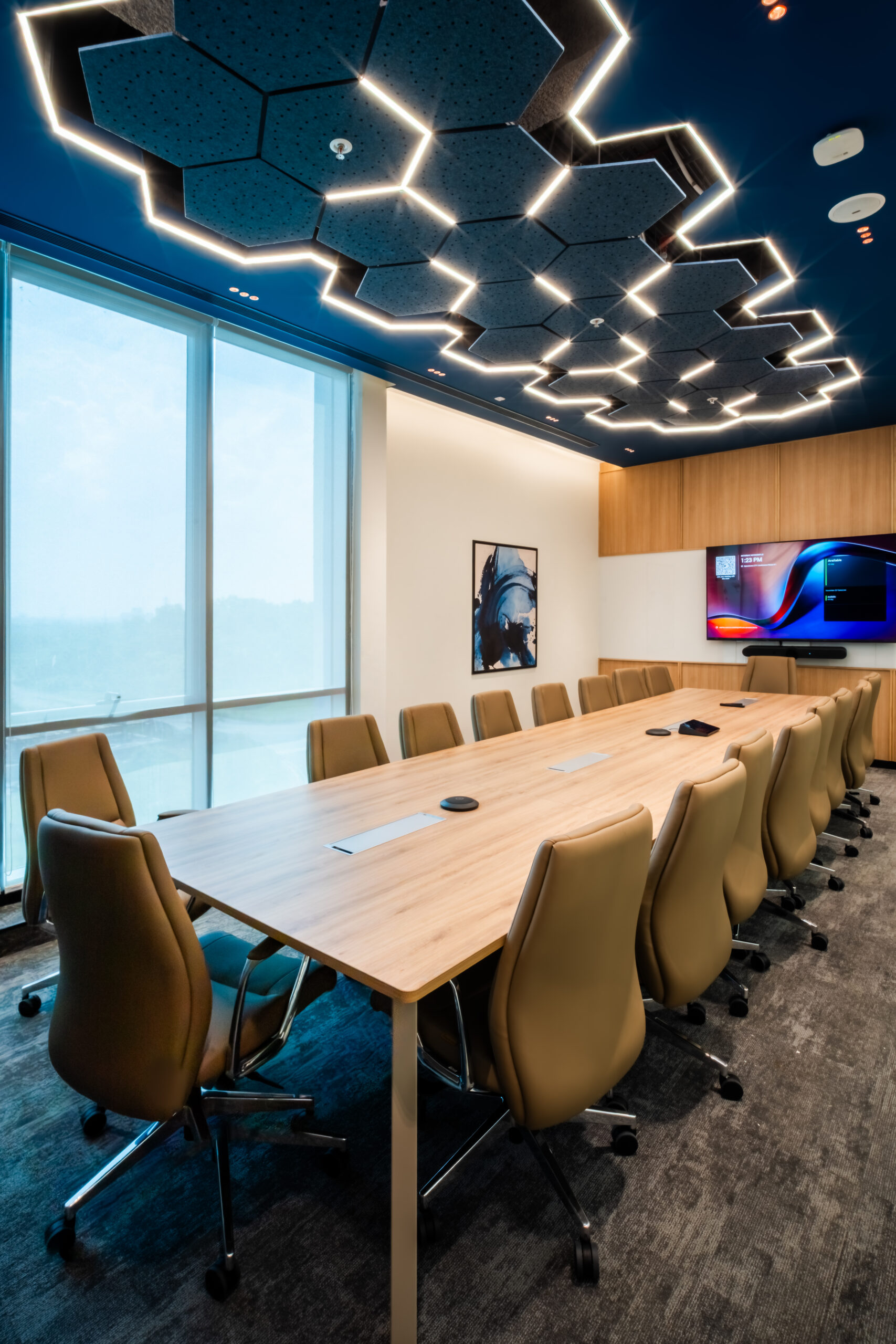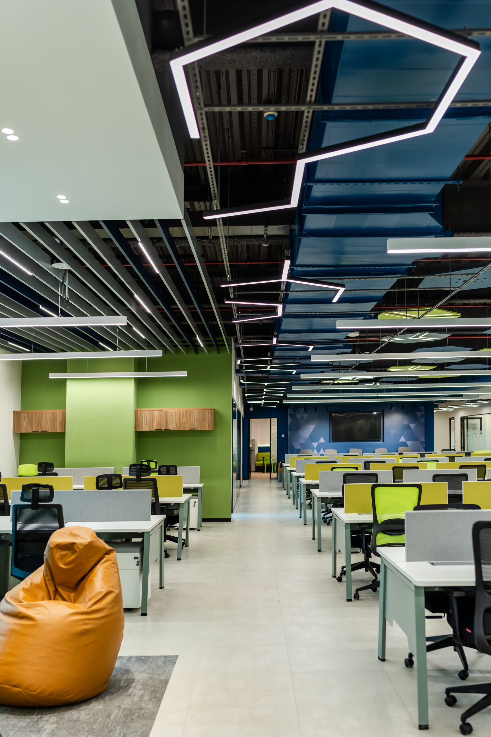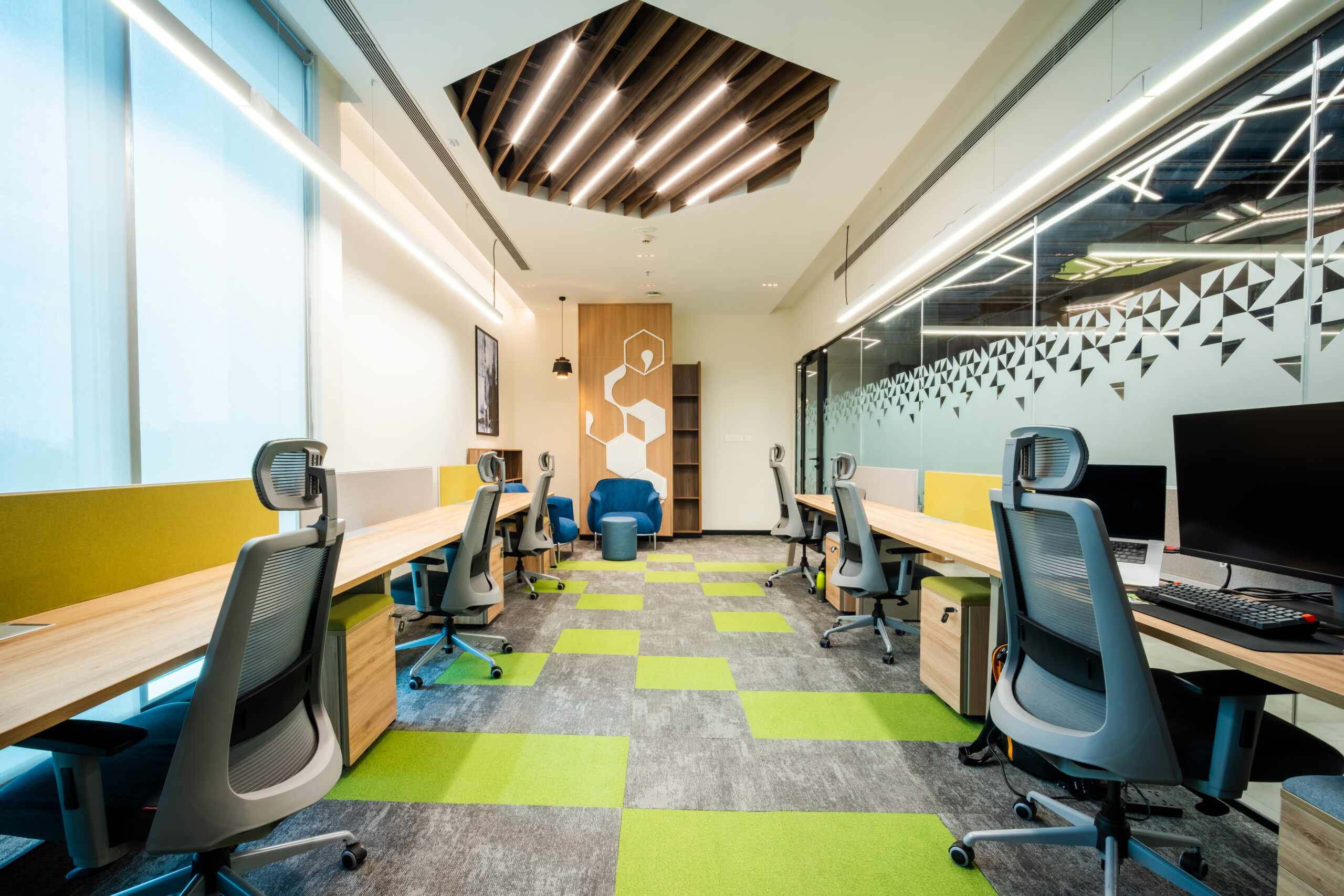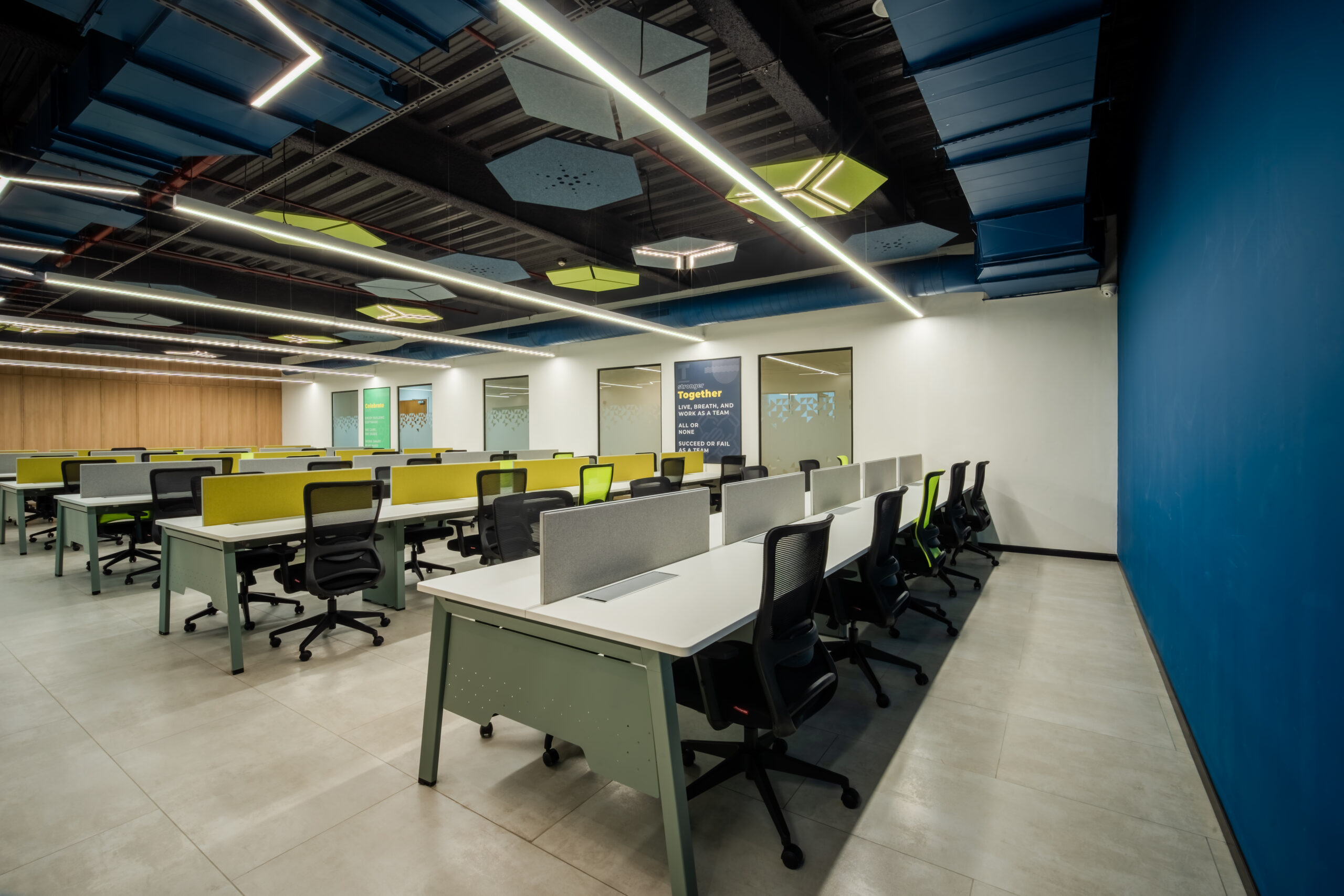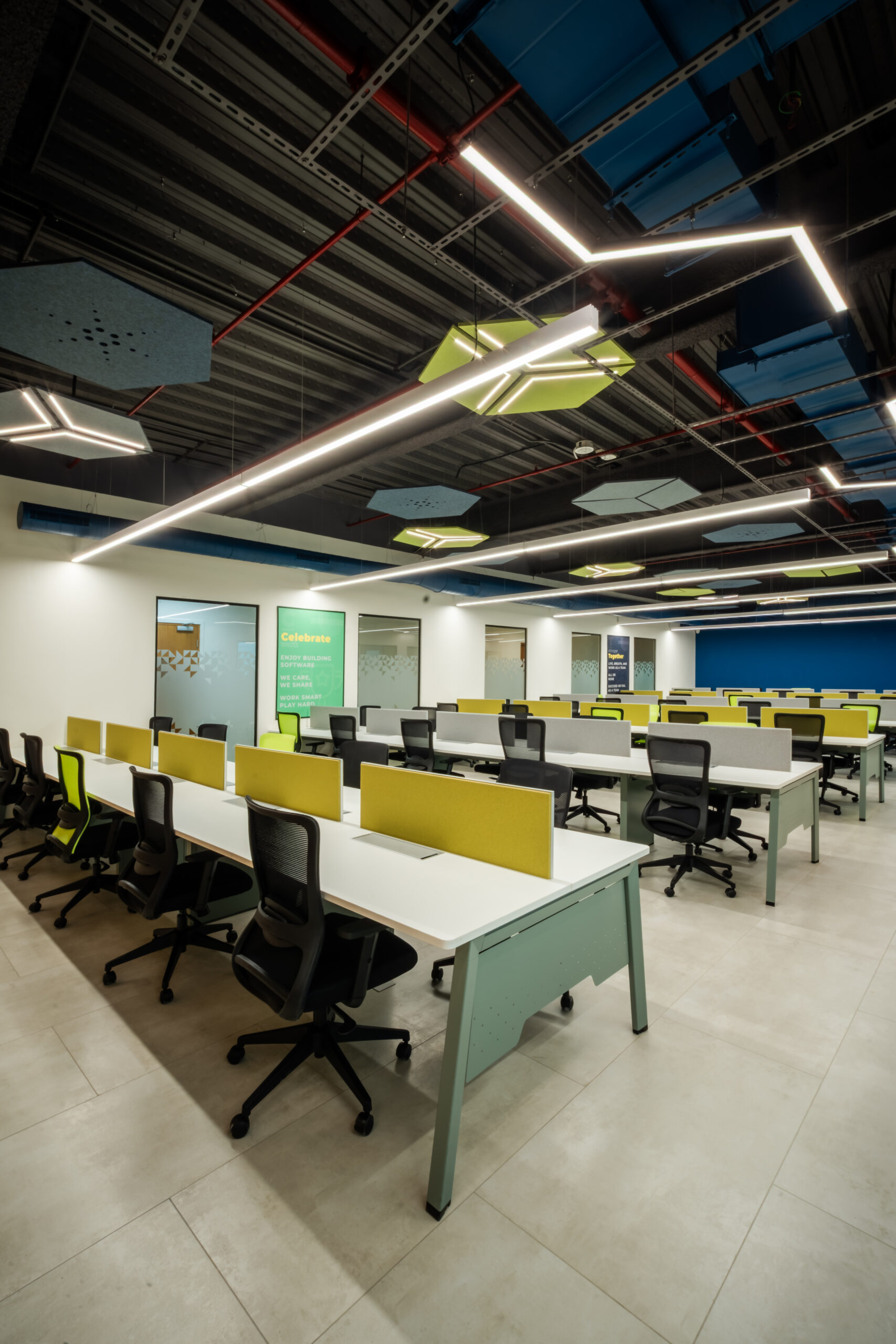 Hexagonal forms, along with the brand’s signature bright green and blue, are expressed across the office through custom hexagonal light fixtures, acoustic panels, wall paneling, branding stickers, and wall decals. The hexagon is intentionally broken, reassembled, and combined in varied configurations across different spaces to avoid monotony, while consistently reinforcing the core brand value. The result is a bold, cohesive workspace that reflects Bytestrone’s identity—where branding, engineering precision, and spatial design come