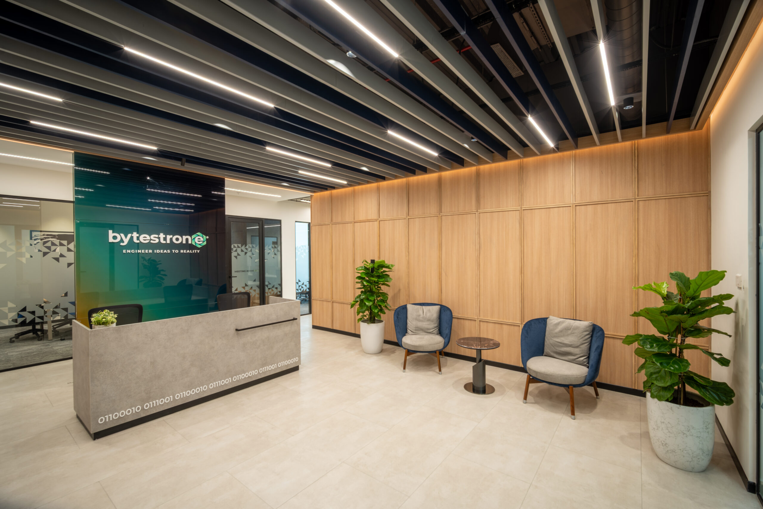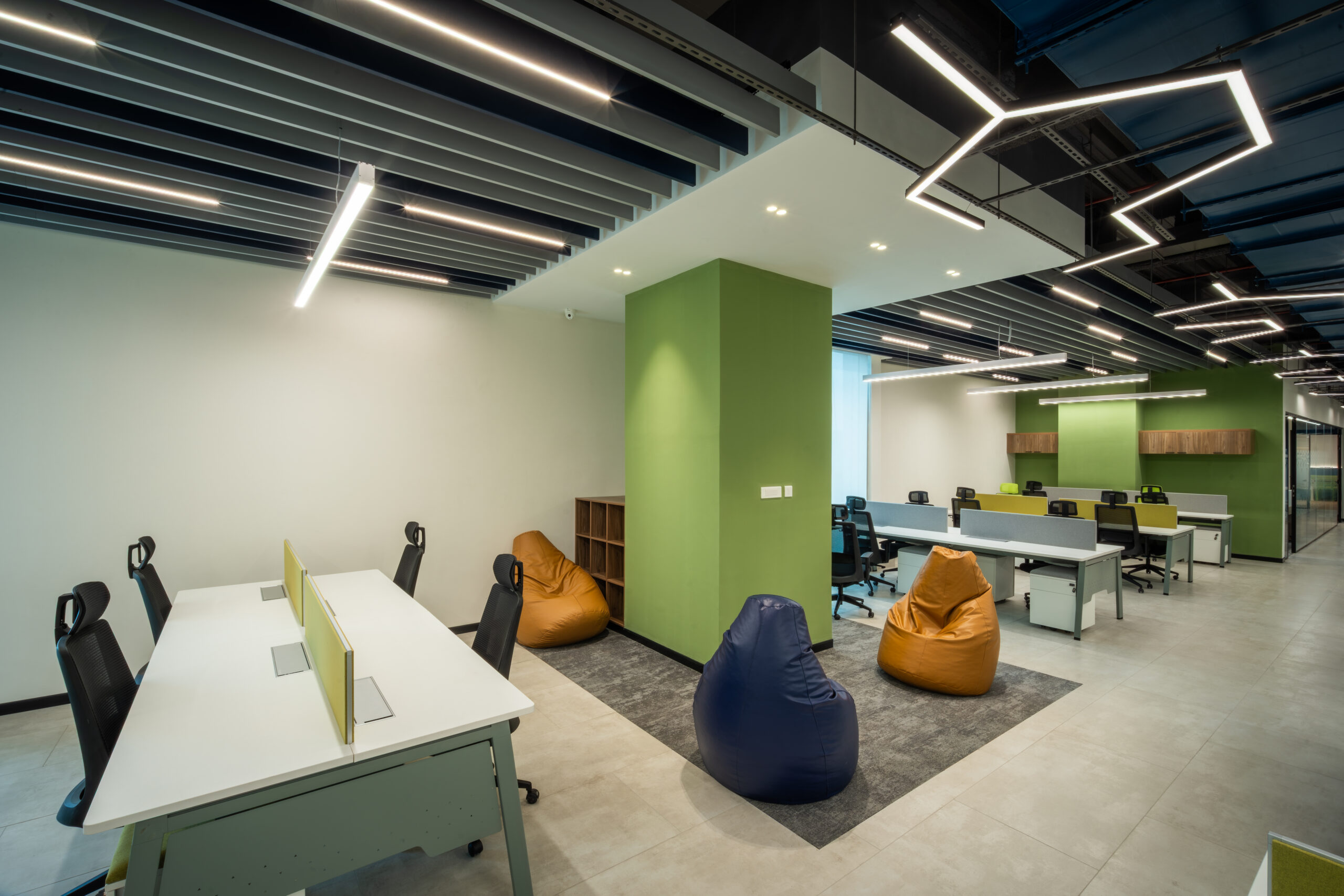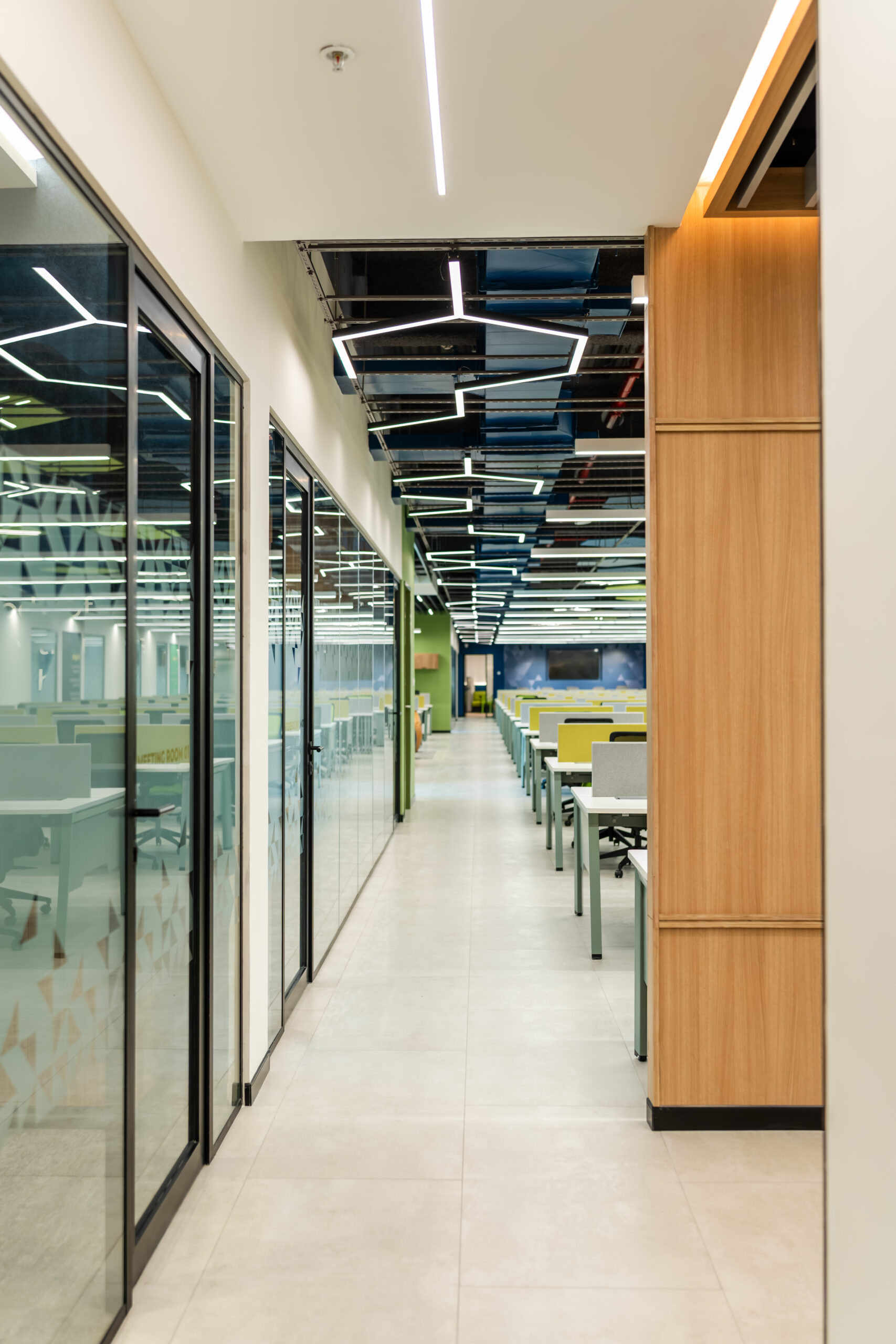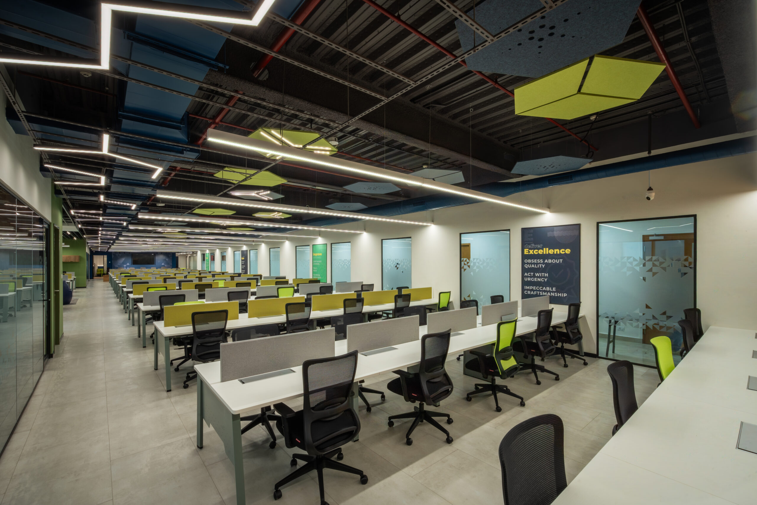 Hexagonal forms, along with the brand’s signature bright green and blue, are expressed across the office through custom hexagonal light fixtures, acoustic panels, wall paneling, branding stickers, and wall decals. The hexagon is intentionally broken, reassembled, and combined in varied configurations across different spaces to avoid monotony, while consistently reinforcing the core brand value. The result is a bold, cohesive workspace that reflects Bytestrone’s identity—where branding, engineering precision, and spatial design come