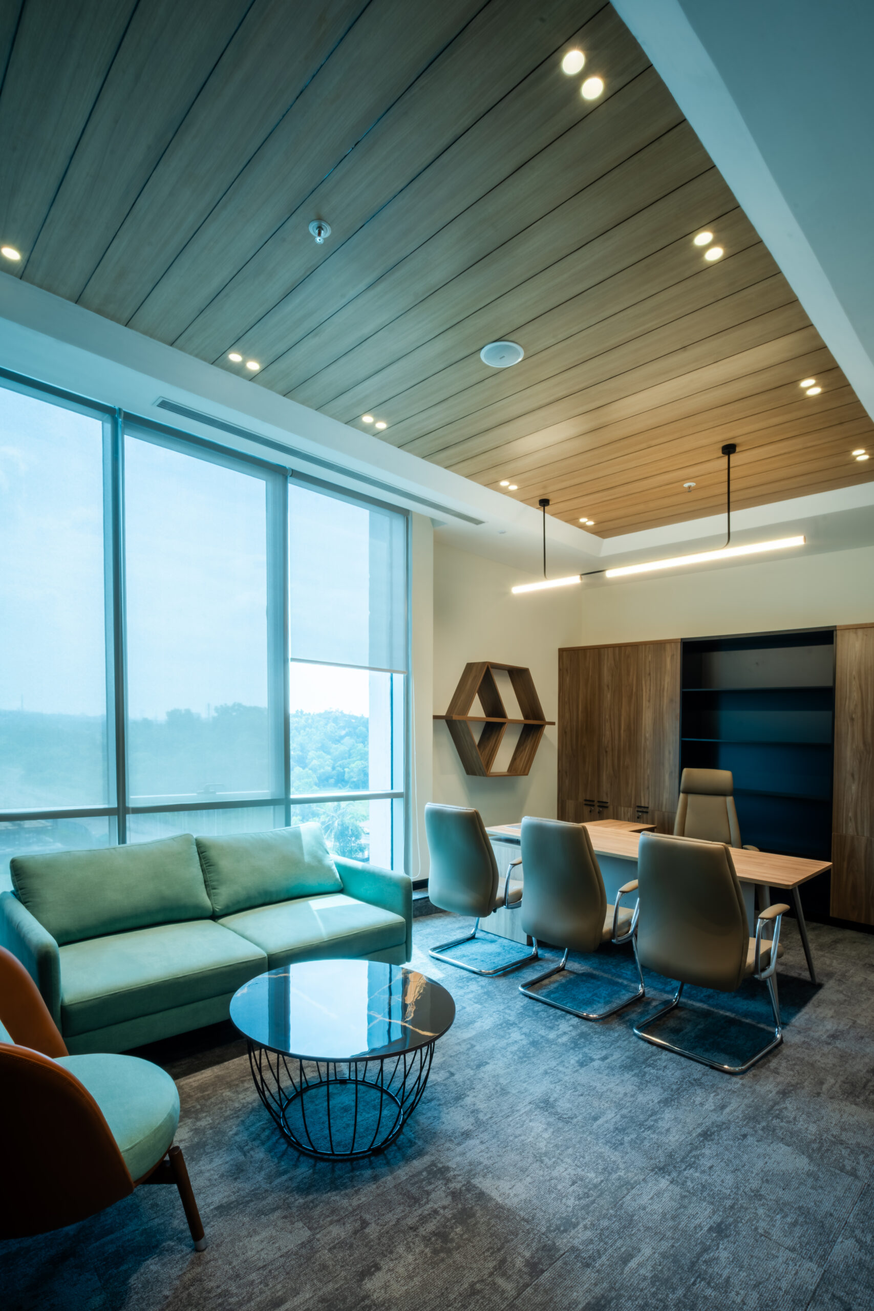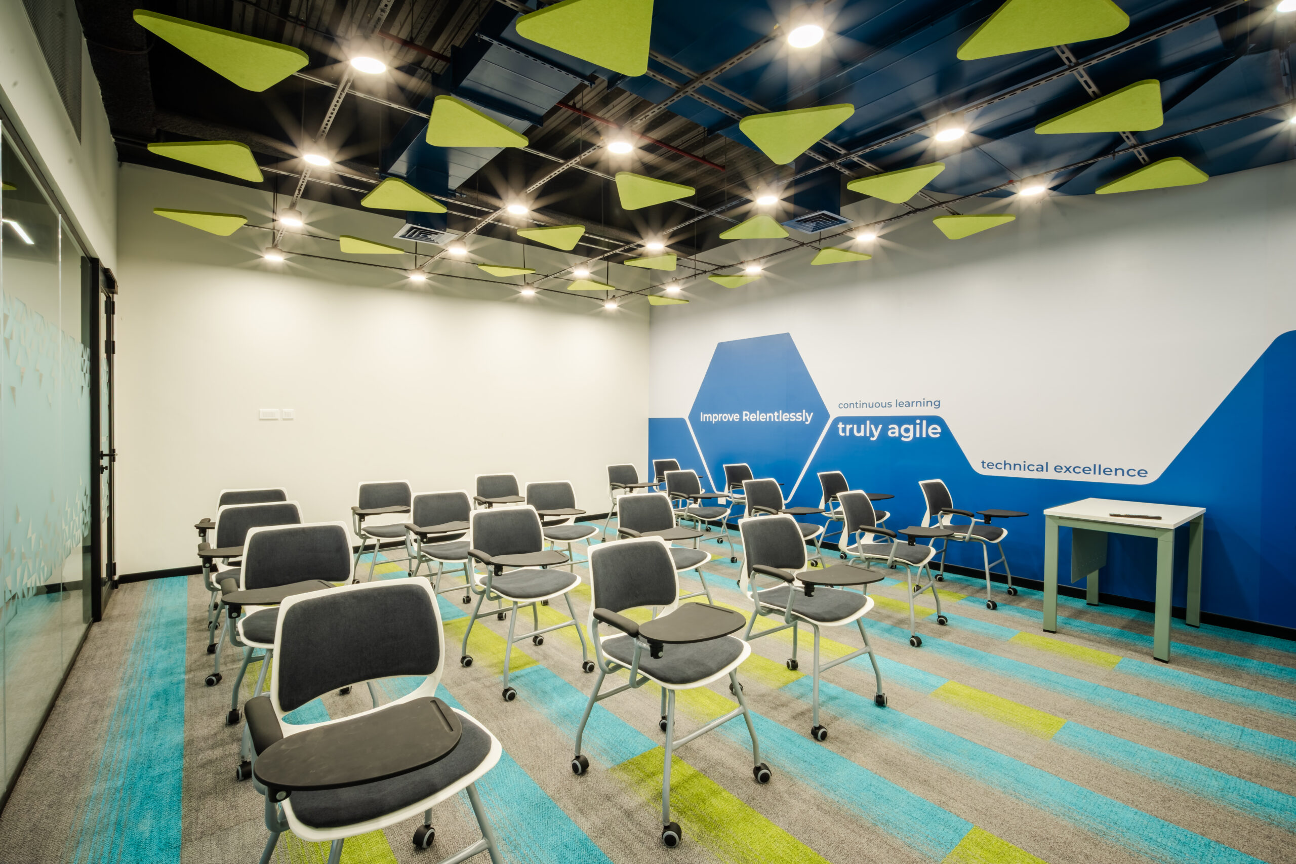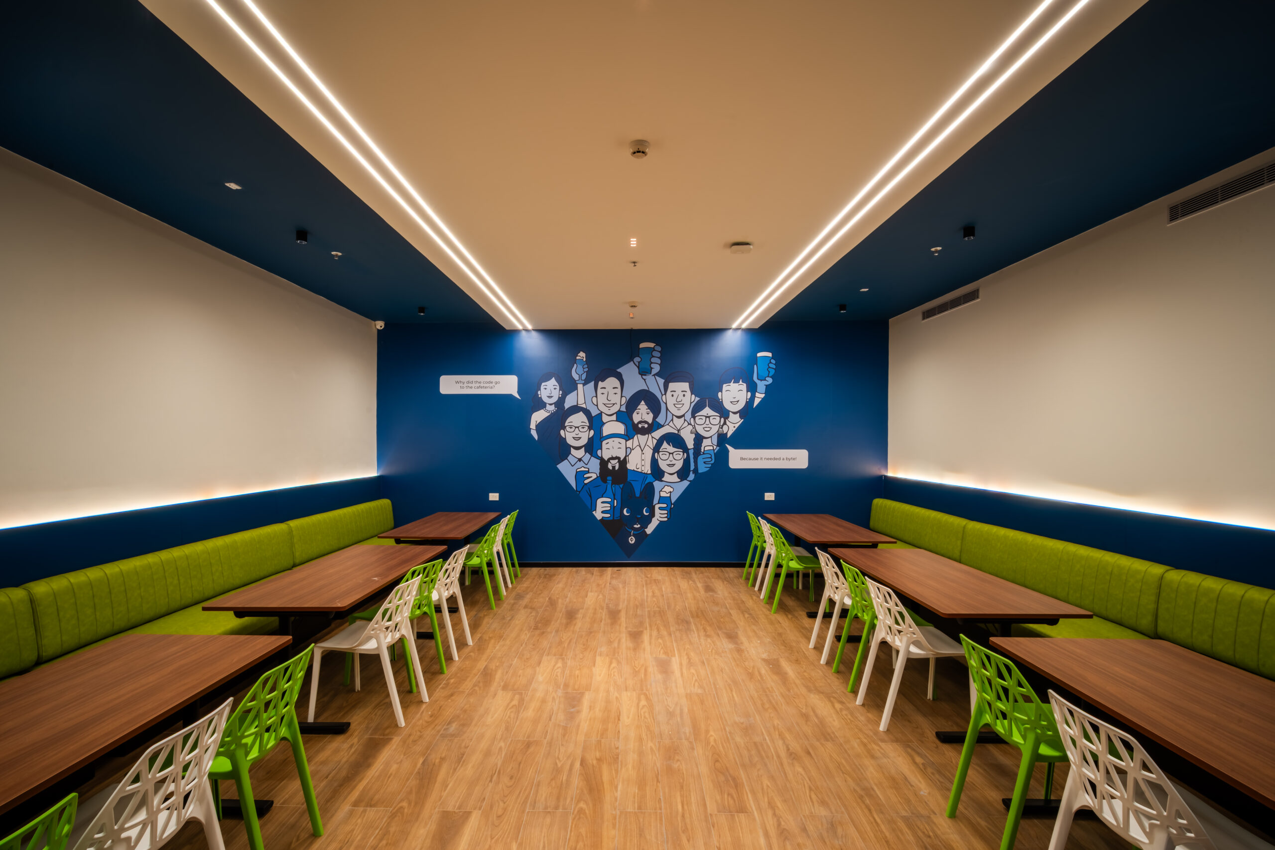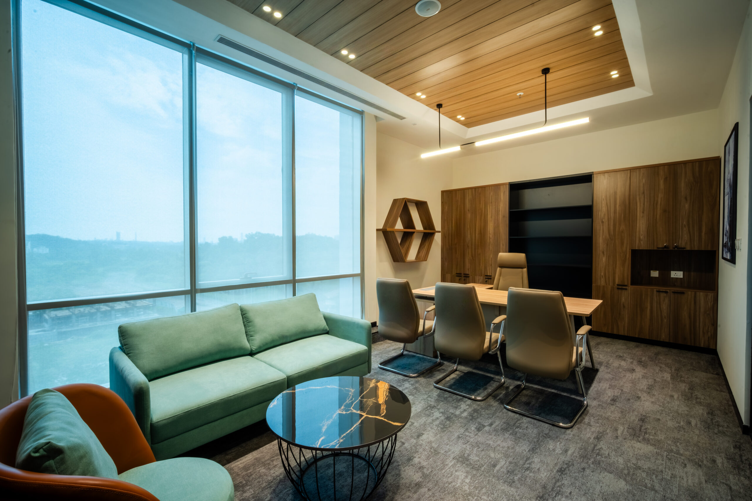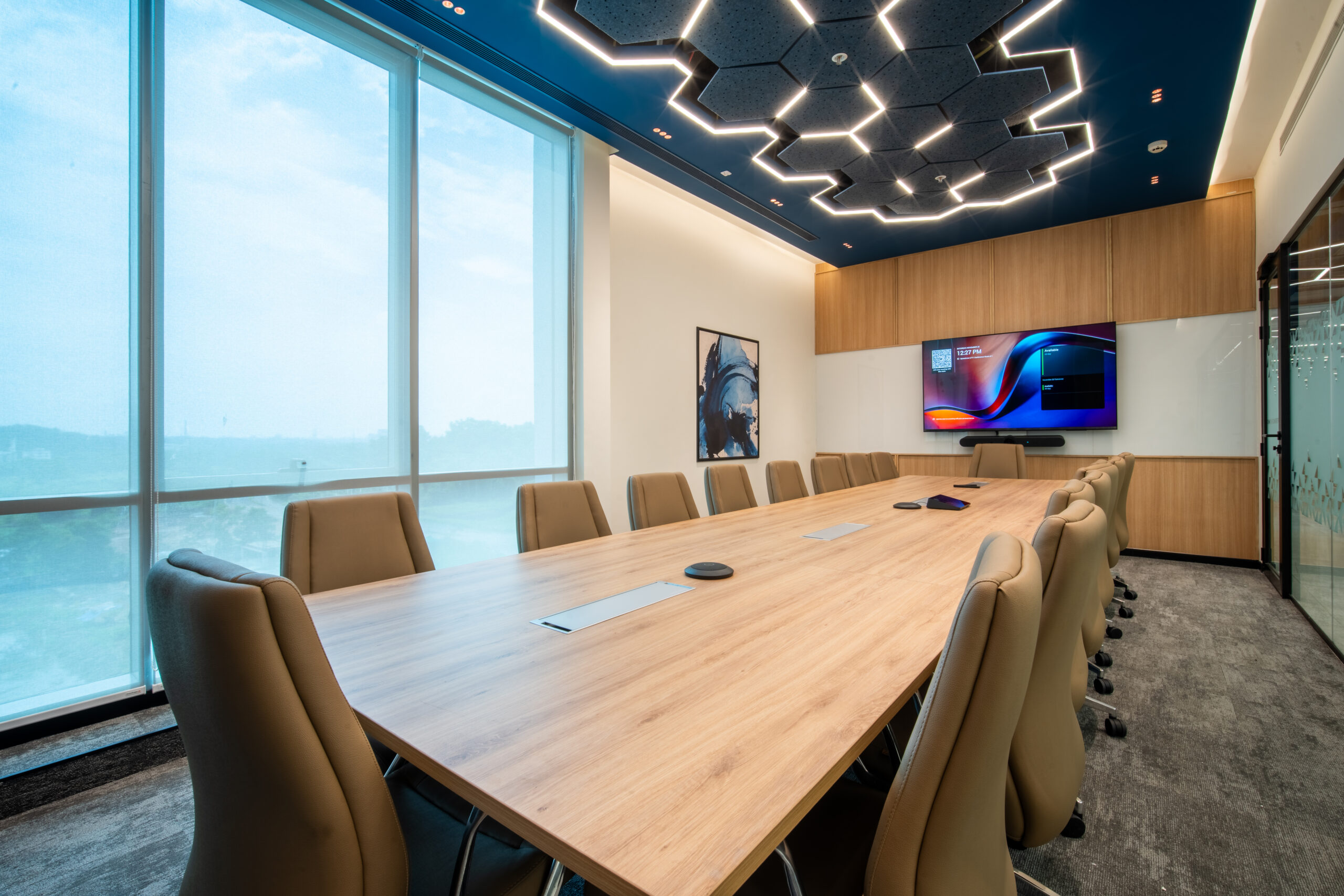 Hexagonal forms, along with the brand’s signature bright green and blue, are expressed across the office through custom hexagonal light fixtures, acoustic panels, wall paneling, branding stickers, and wall decals. The hexagon is intentionally broken, reassembled, and combined in varied configurations across different spaces to avoid monotony, while consistently reinforcing the core brand value. The result is a bold, cohesive workspace that reflects Bytestrone’s identity—where branding, engineering precision, and spatial design come