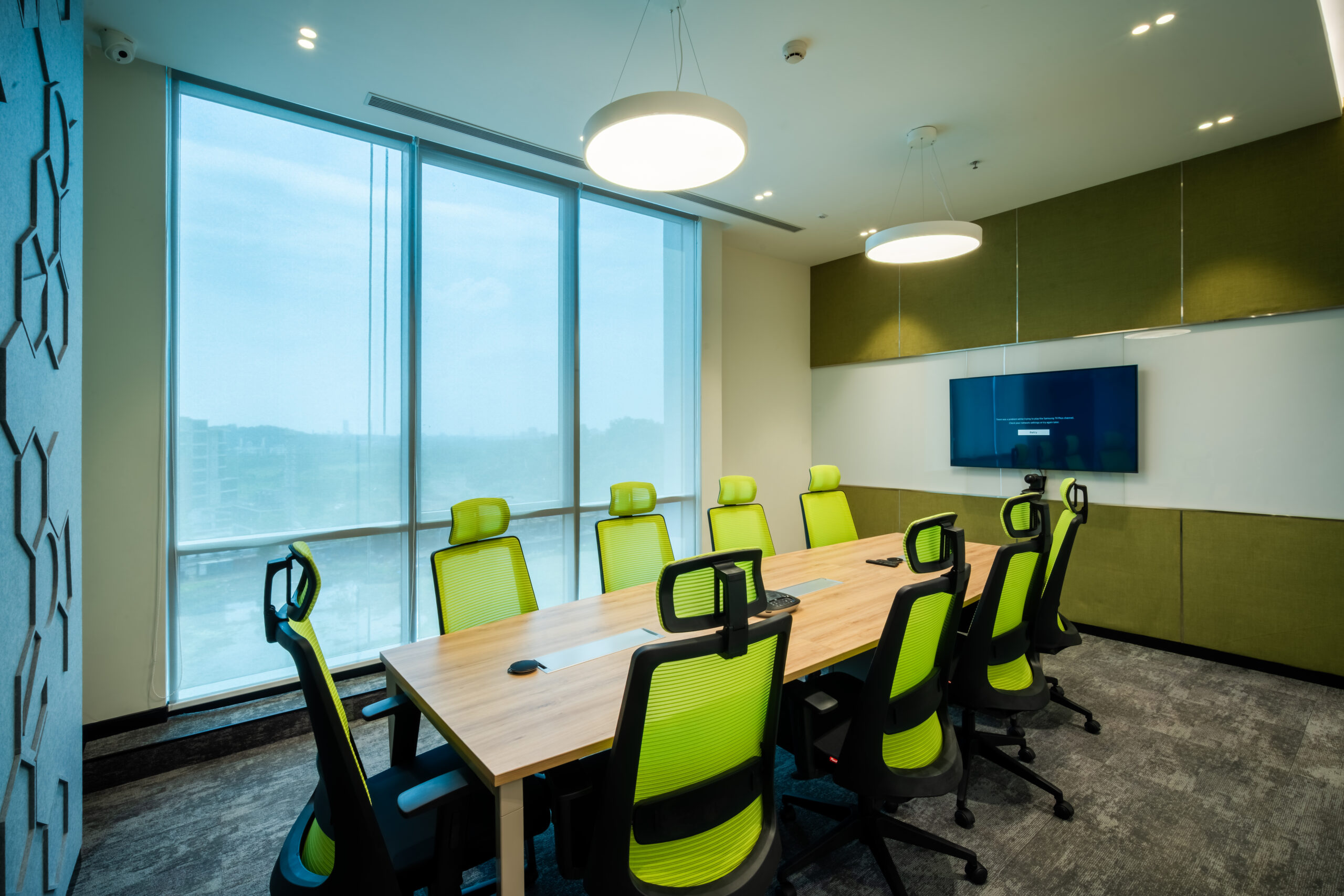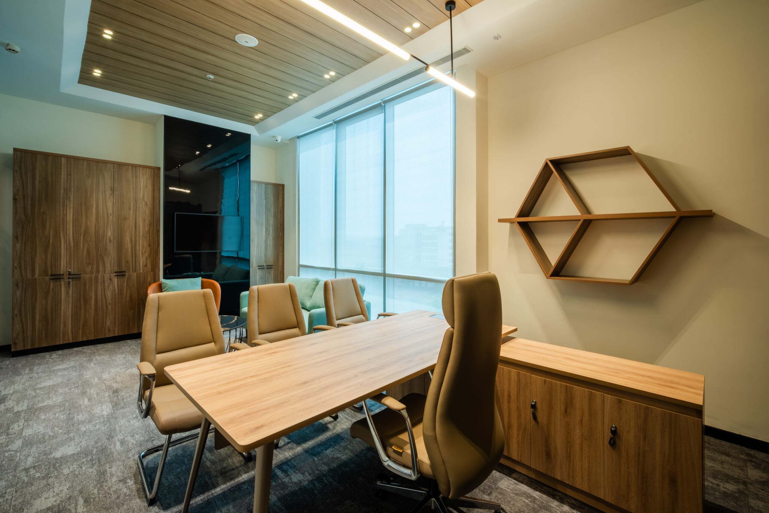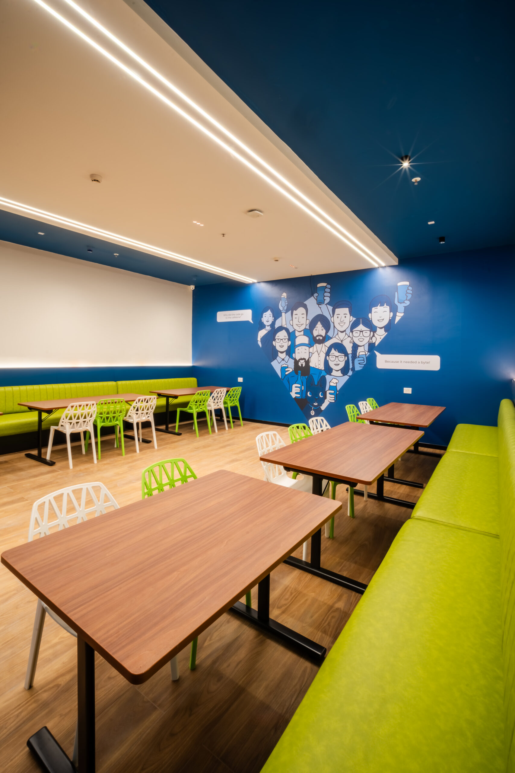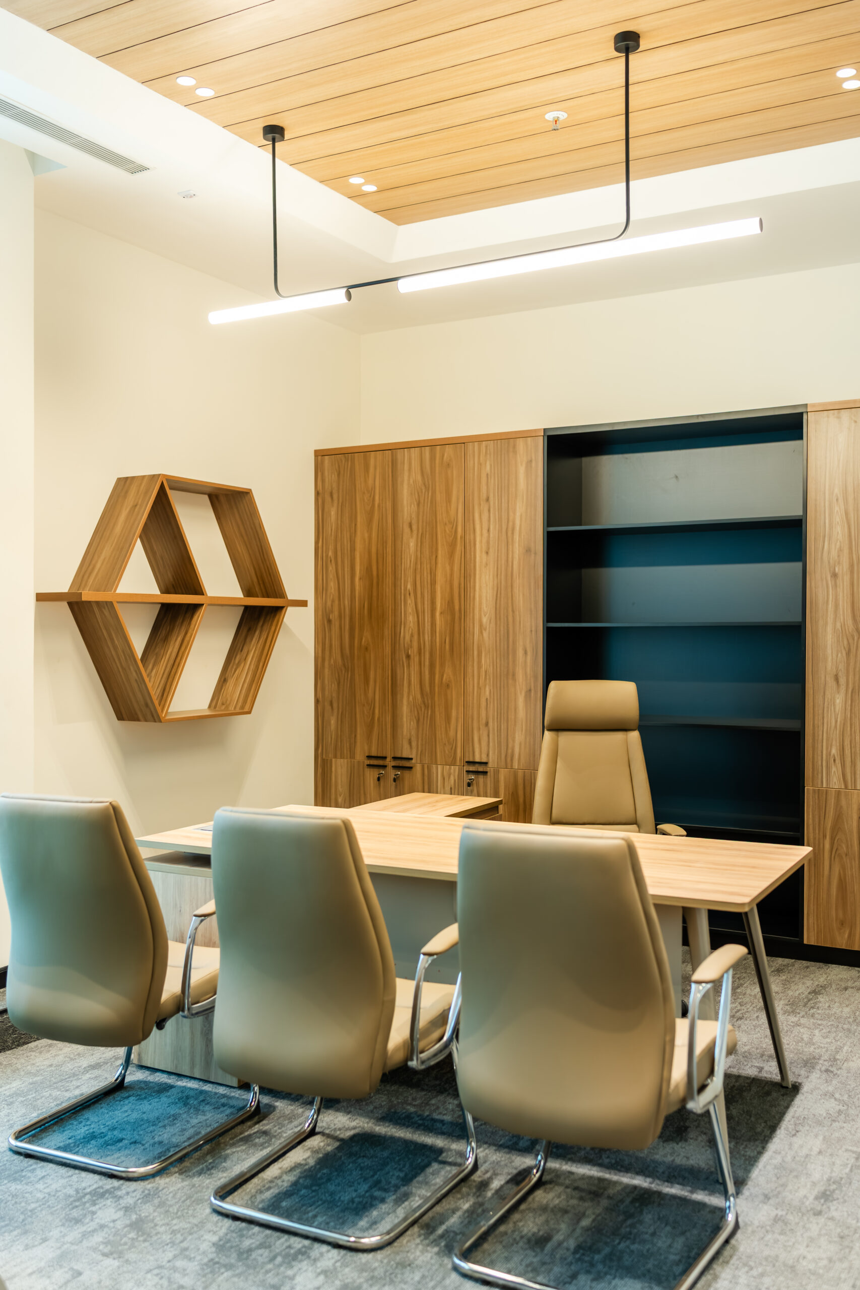 Hexagonal forms, along with the brand’s signature bright green and blue, are expressed across the office through custom hexagonal light fixtures, acoustic panels, wall paneling, branding stickers, and wall decals. The hexagon is intentionally broken, reassembled, and combined in varied configurations across different spaces to avoid monotony, while consistently reinforcing the core brand value. The result is a bold, cohesive workspace that reflects Bytestrone’s identity—where branding, engineering precision, and spatial design come