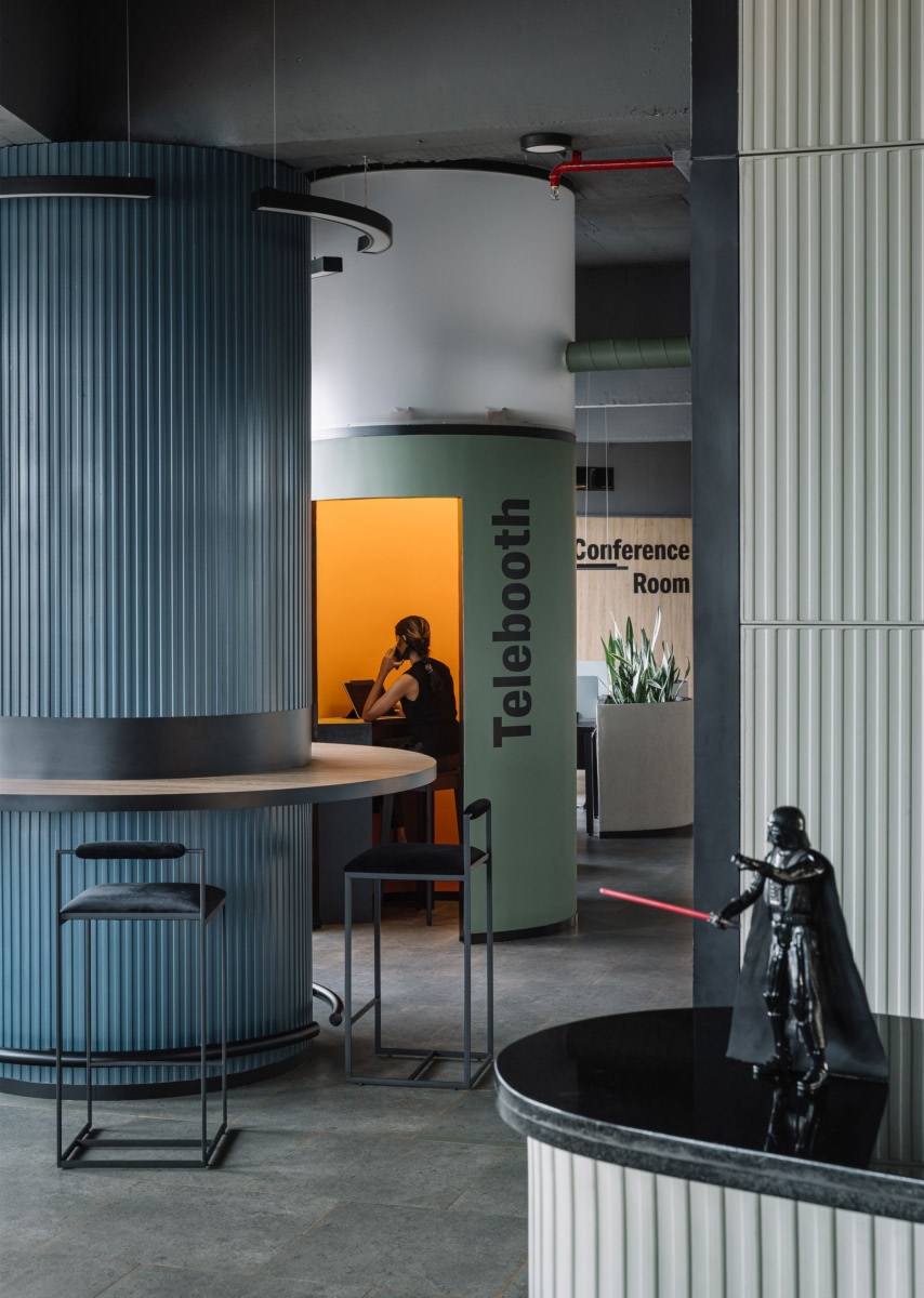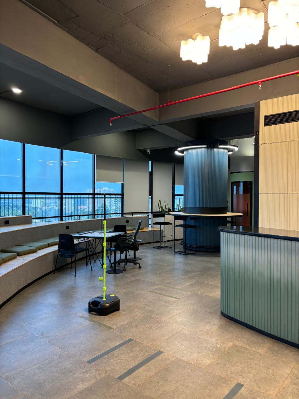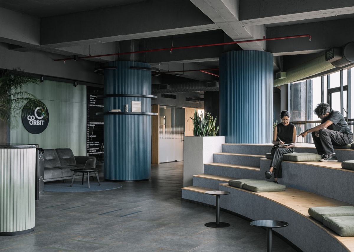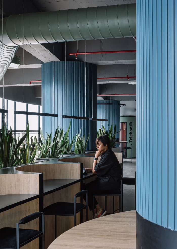 Key elements such as amphitheater style stepped seating and cylindrical architectural cores act as anchors within the open plan—housing informal meeting zones, work counters, phone booths, and breakout spaces. These forms help organize the floor while preserving visual openness.