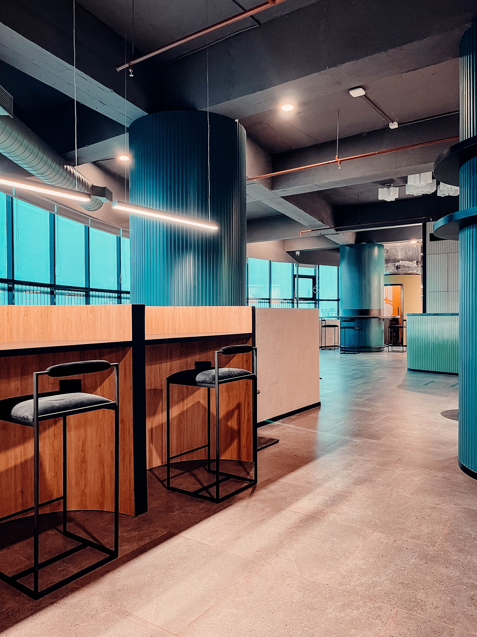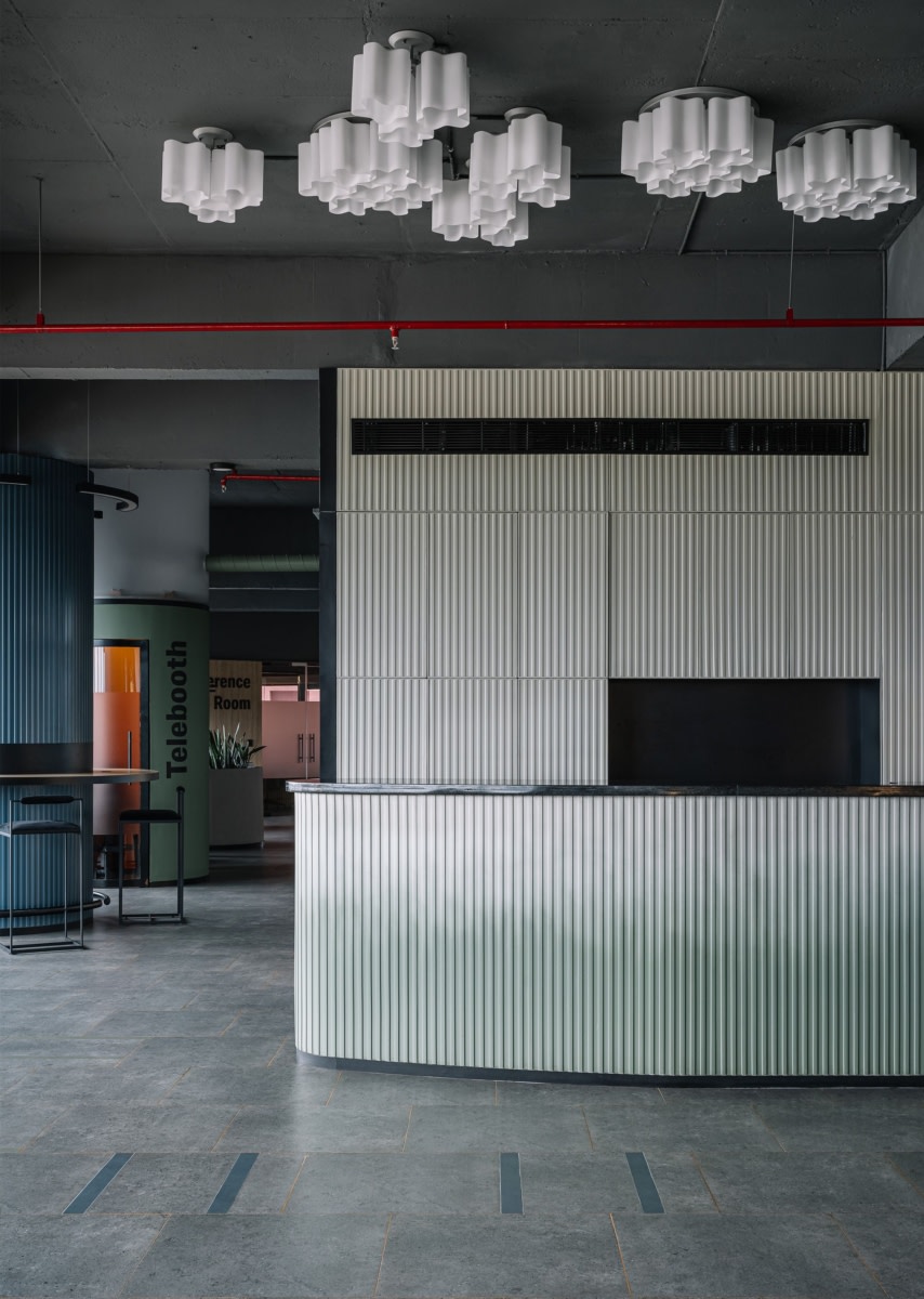 A restrained material palette of exposed concrete, fluted surfaces, muted blues and greens, warm wood, and soft upholstery balances industrial character with comfort. Lighting and acoustics are carefully integrated to define zones without enclosure, allowing the space to remain adaptable and intuitive.