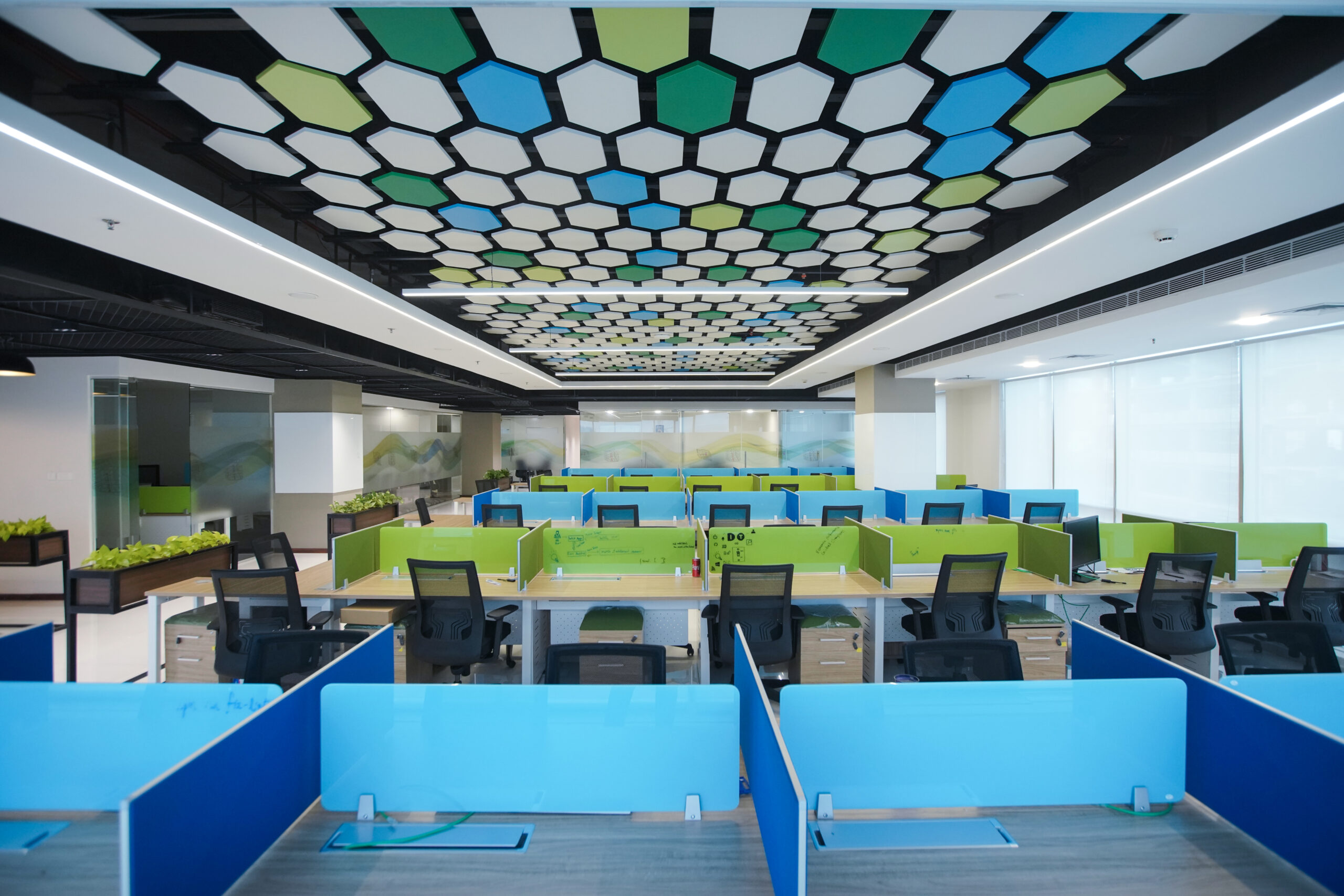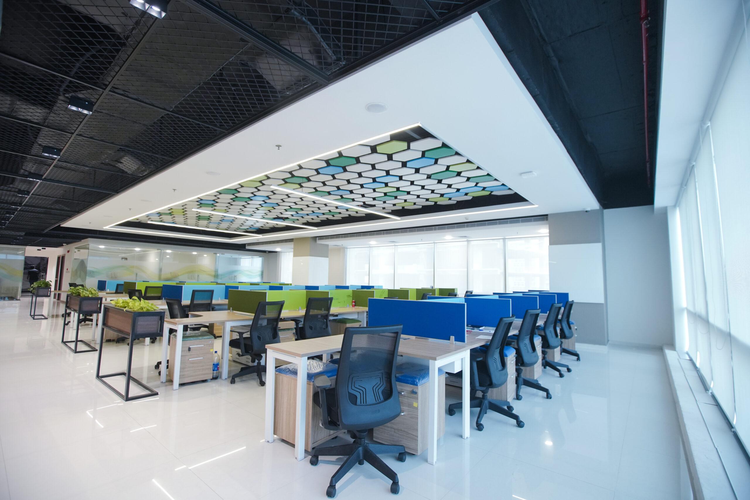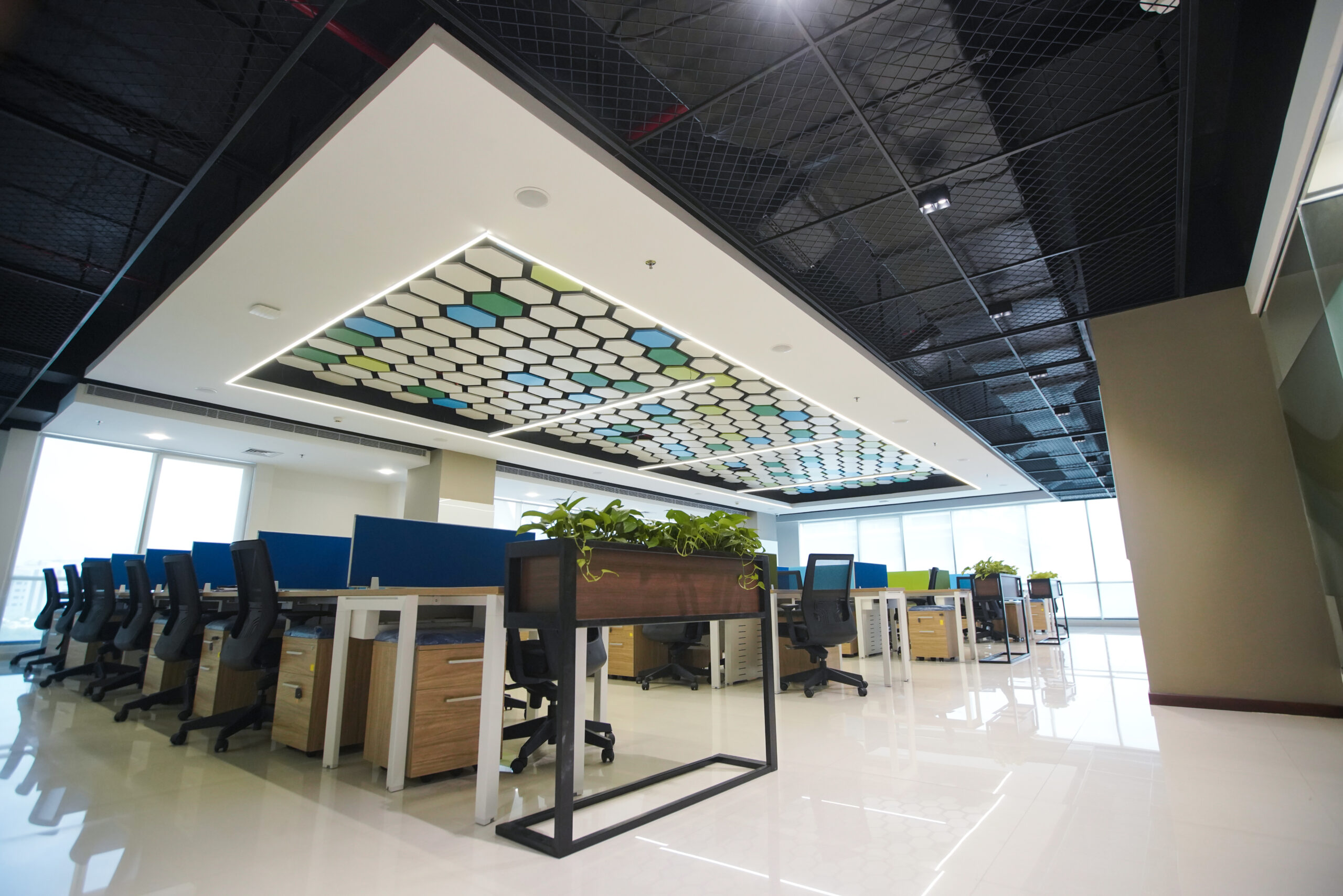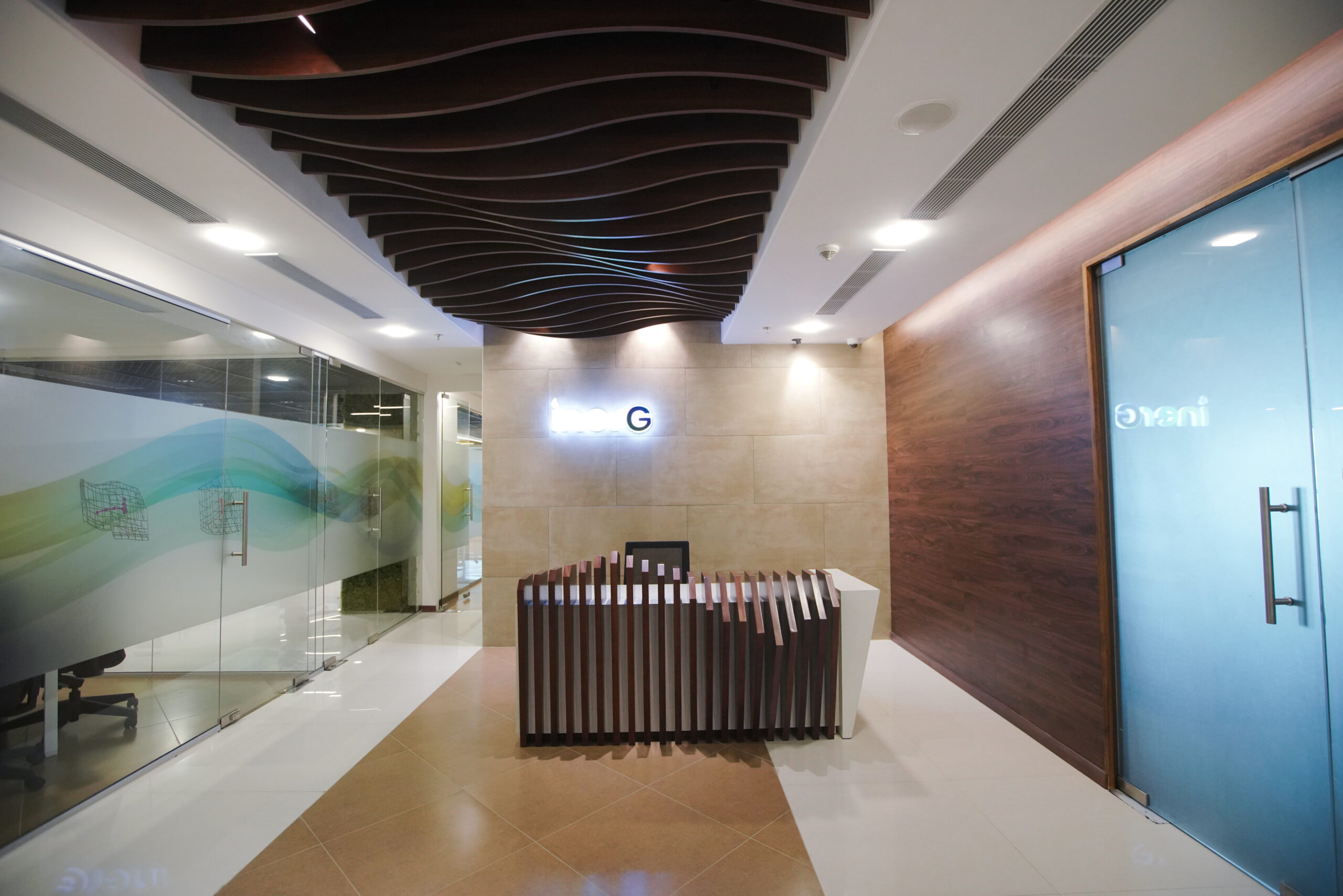 We designed INERG’s corporate office to embody flow, movement, and collaboration. The minimalistic reception features exquisite furniture and a sculptural fin-clad countertop, echoing fluidity. A dynamic baffle ceiling mimics waves, enhancing spatial rhythm. The workstation area integrates biophilic elements, with planter boxes and a hexagonal ceiling resembling a honeycomb—symbolizing unity. Custom in-house furniture fabrication ensures seamless integration. The conference room boasts high-tech support for global meetings. A Kerala-inspired pantry, with tea stall-themed graphics and cargo boat-inspired furniture, adds local character. The cohesive color palette, balancing blues, greens, wood, and white, reinforces harmony and productivity in this meticulously curated workspace.