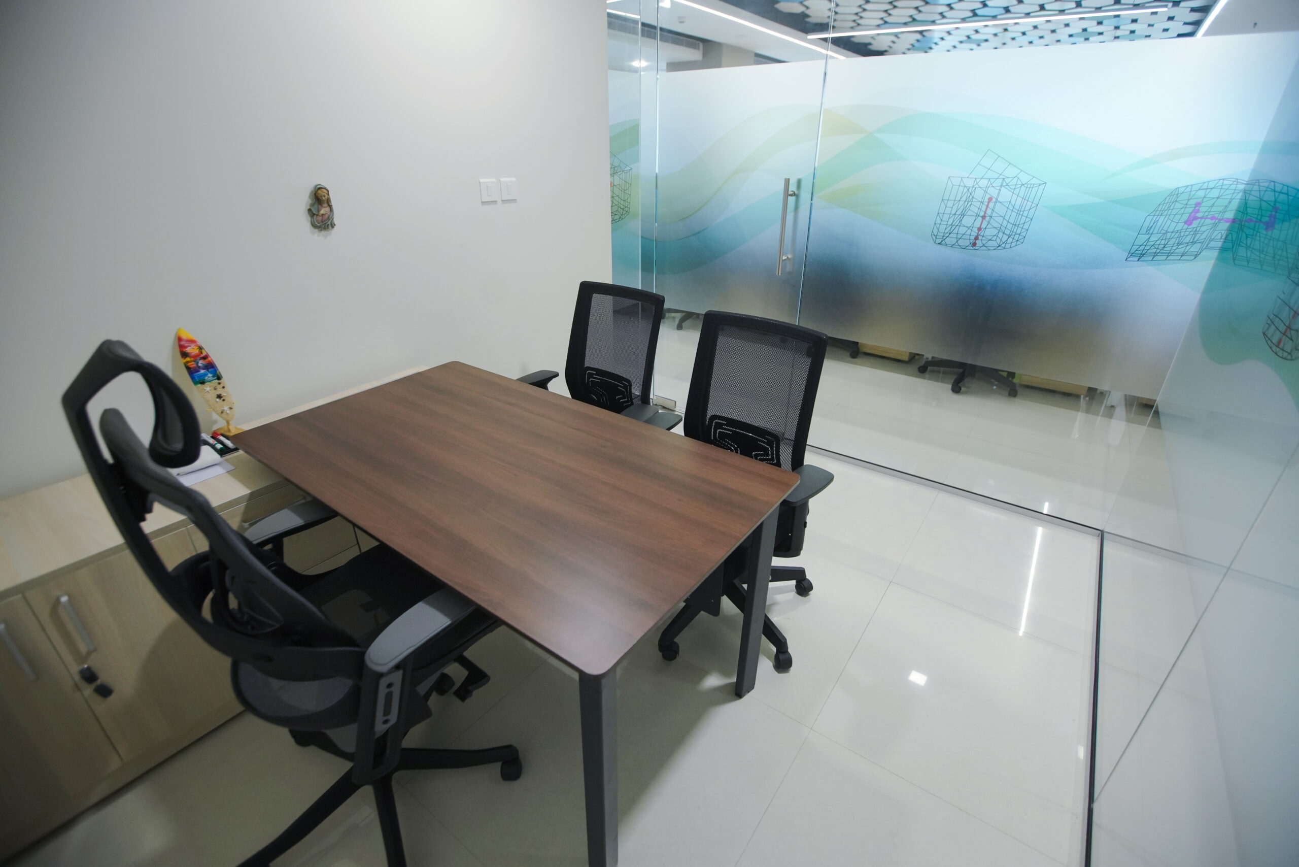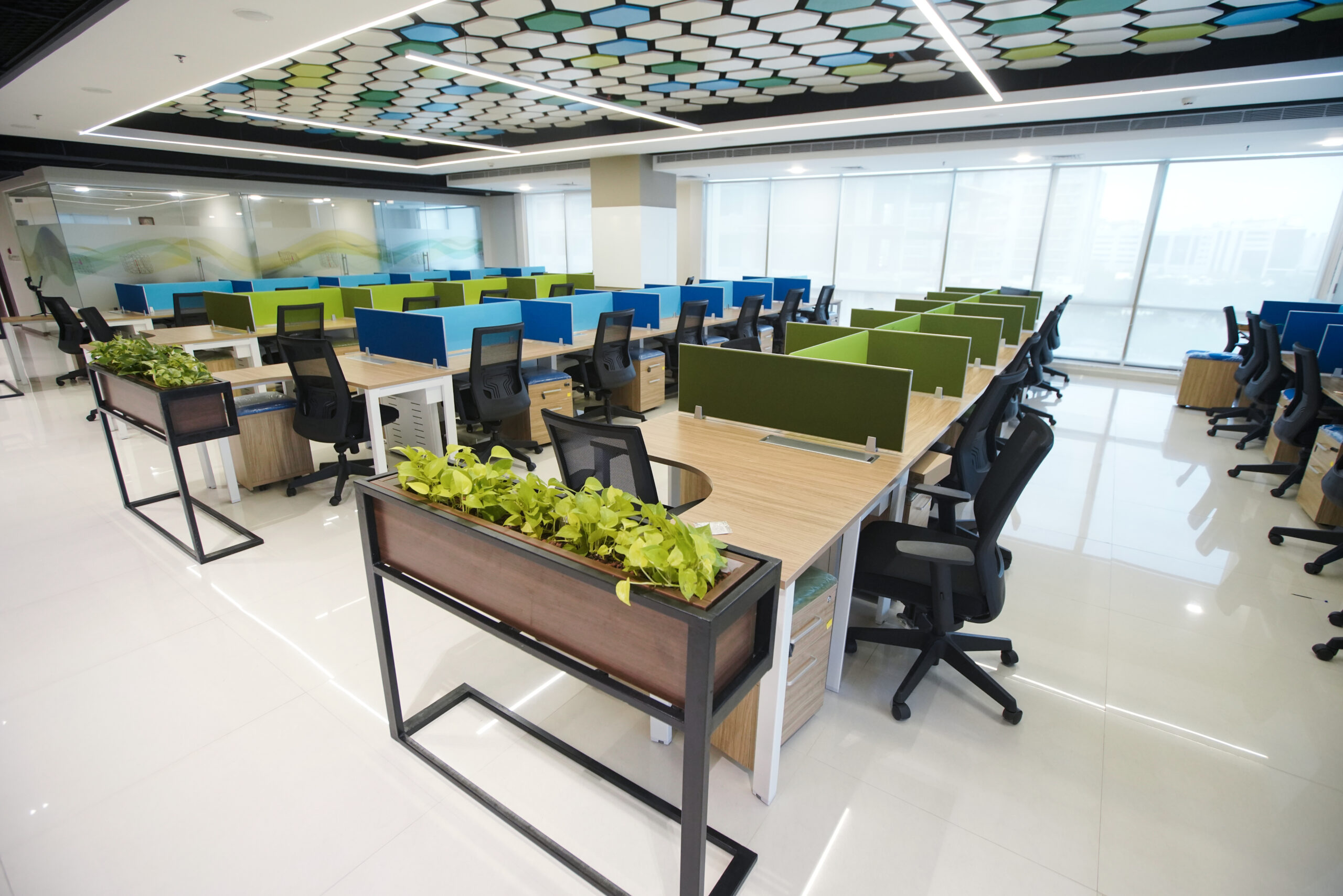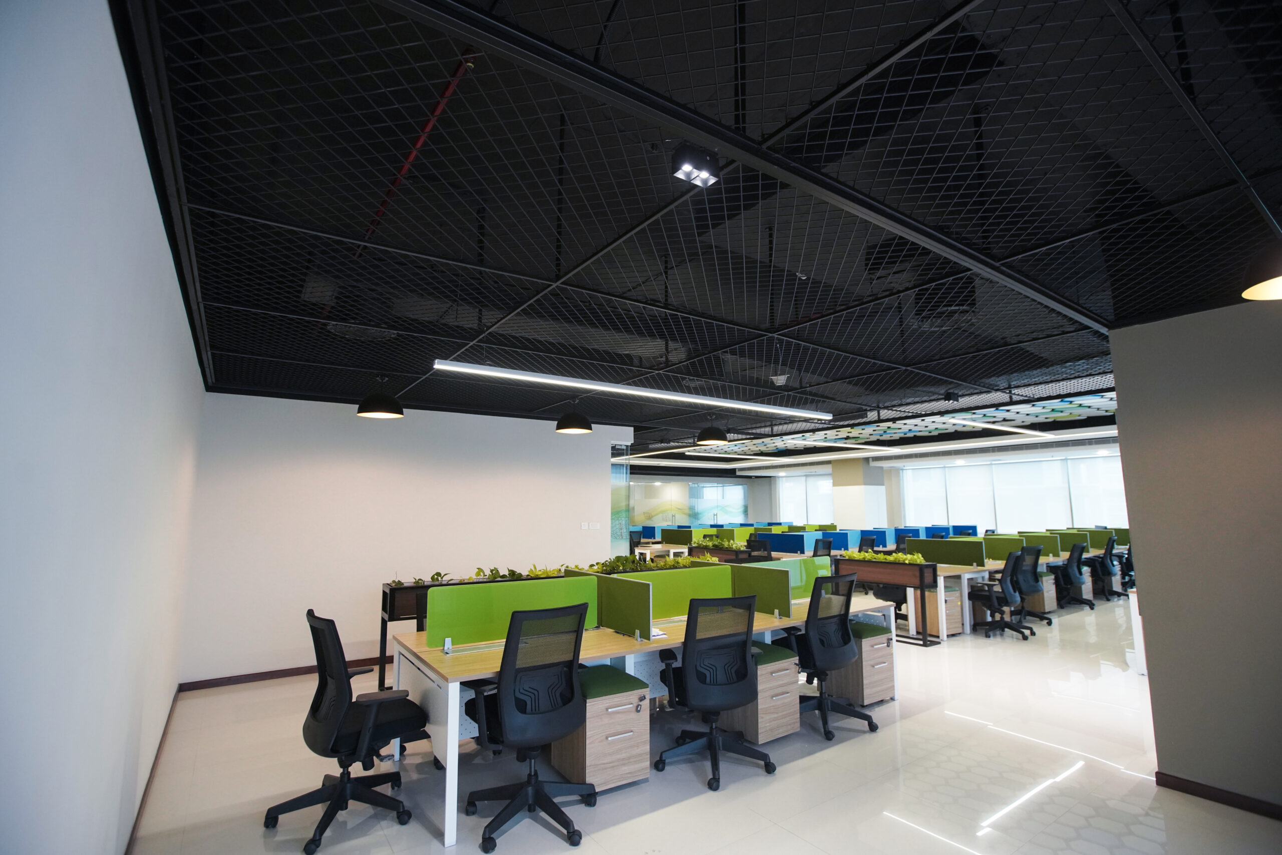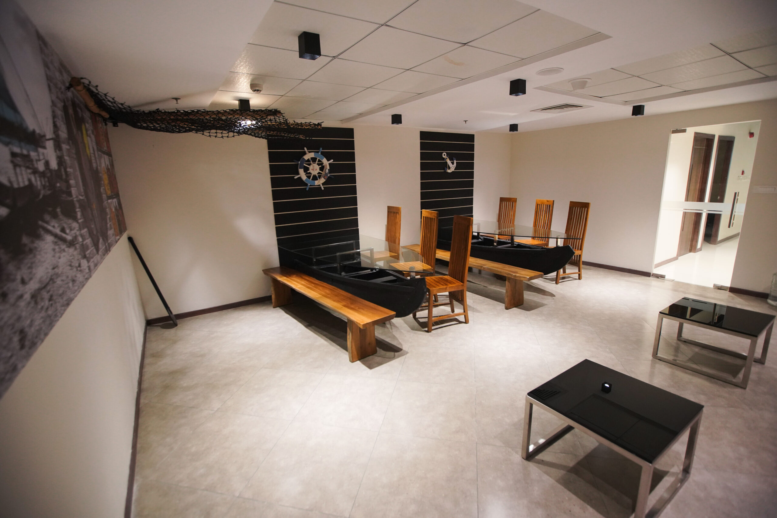 We designed INERG’s corporate office to embody flow, movement, and collaboration. The minimalistic reception features exquisite furniture and a sculptural fin-clad countertop, echoing fluidity. A dynamic baffle ceiling mimics waves, enhancing spatial rhythm. The workstation area integrates biophilic elements, with planter boxes and a hexagonal ceiling resembling a honeycomb—symbolizing unity. Custom in-house furniture fabrication ensures seamless integration. The conference room boasts high-tech support for global meetings. A Kerala-inspired pantry, with tea stall-themed graphics and cargo boat-inspired furniture, adds local character. The cohesive color palette, balancing blues, greens, wood, and white, reinforces harmony and productivity in this meticulously curated workspace.