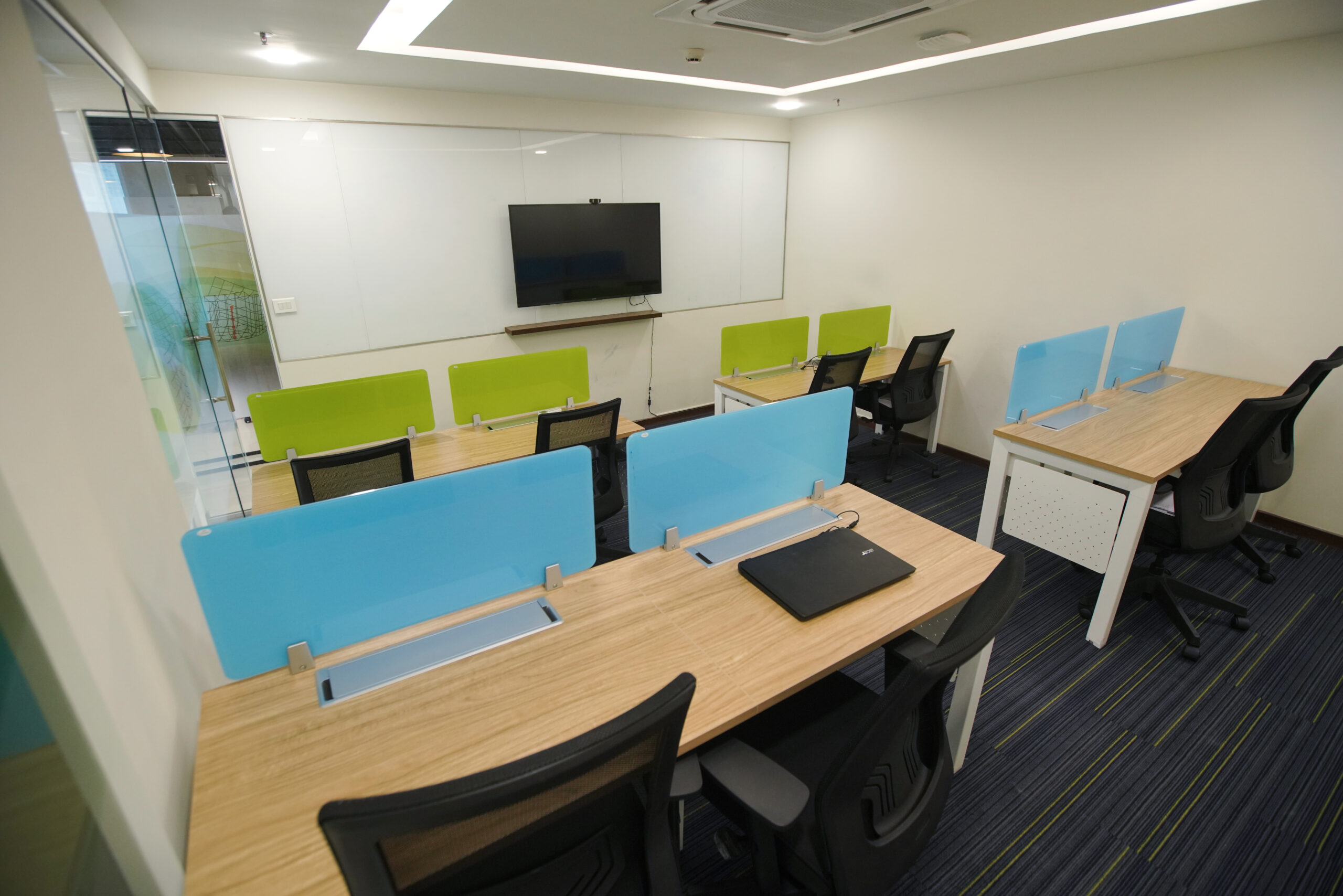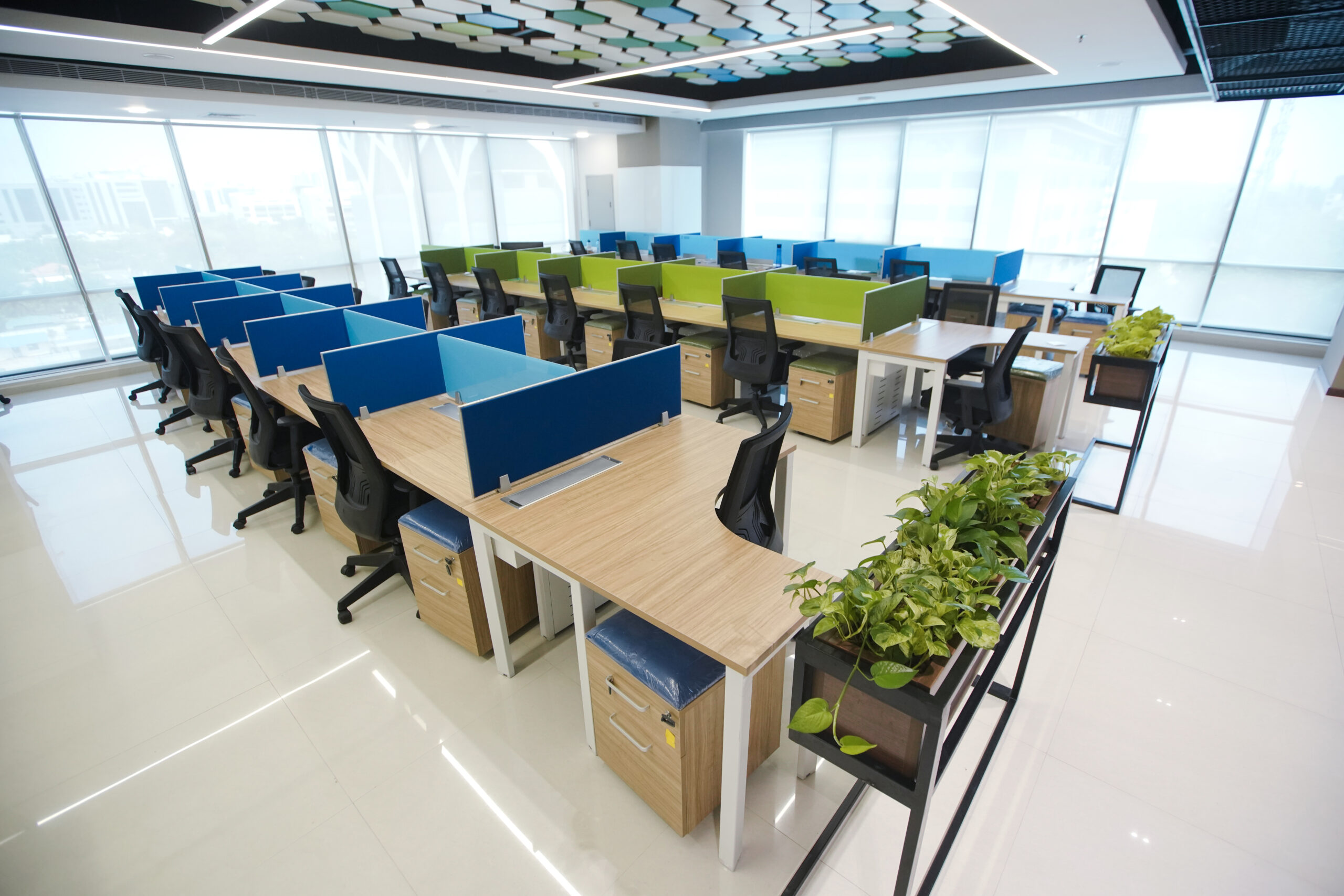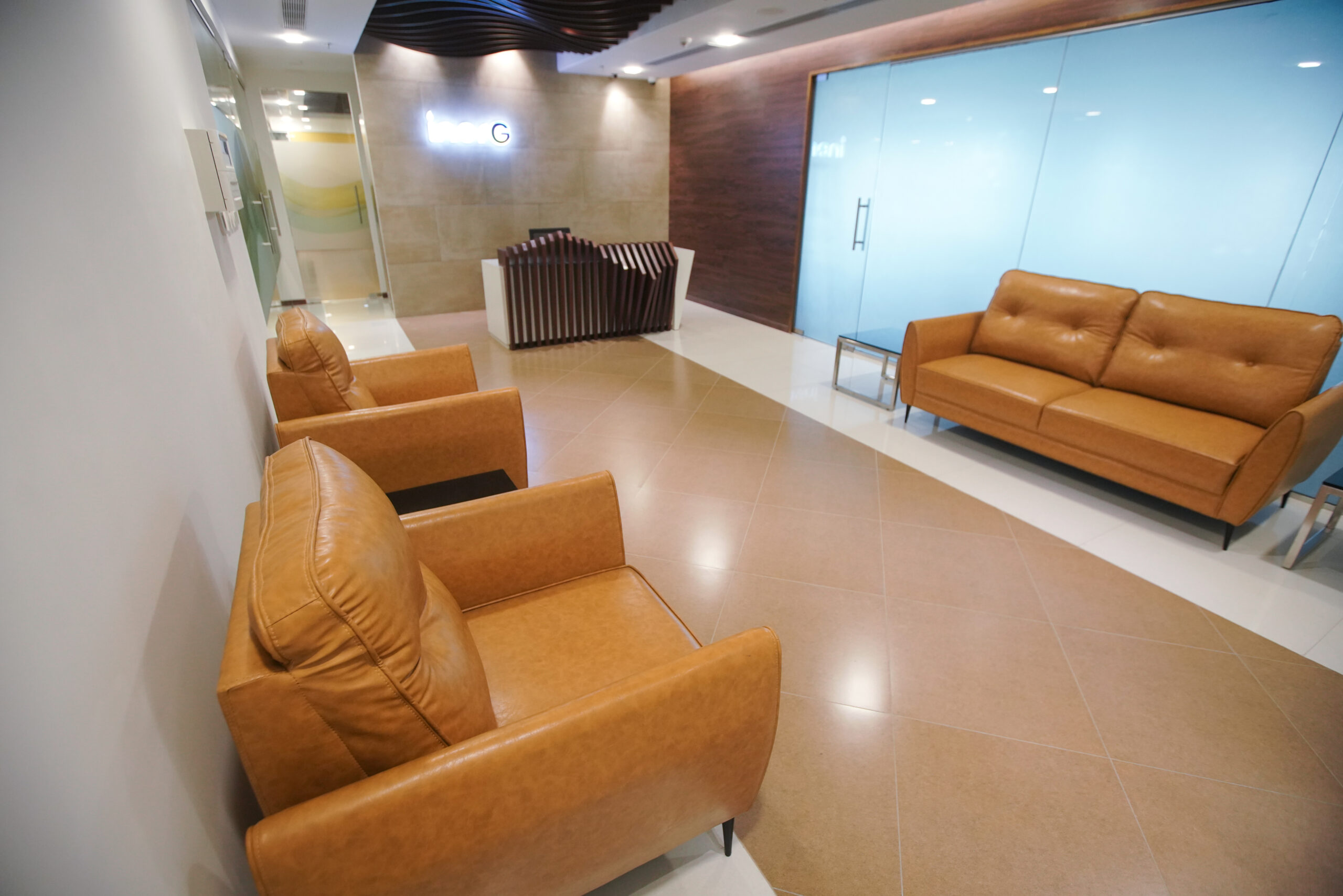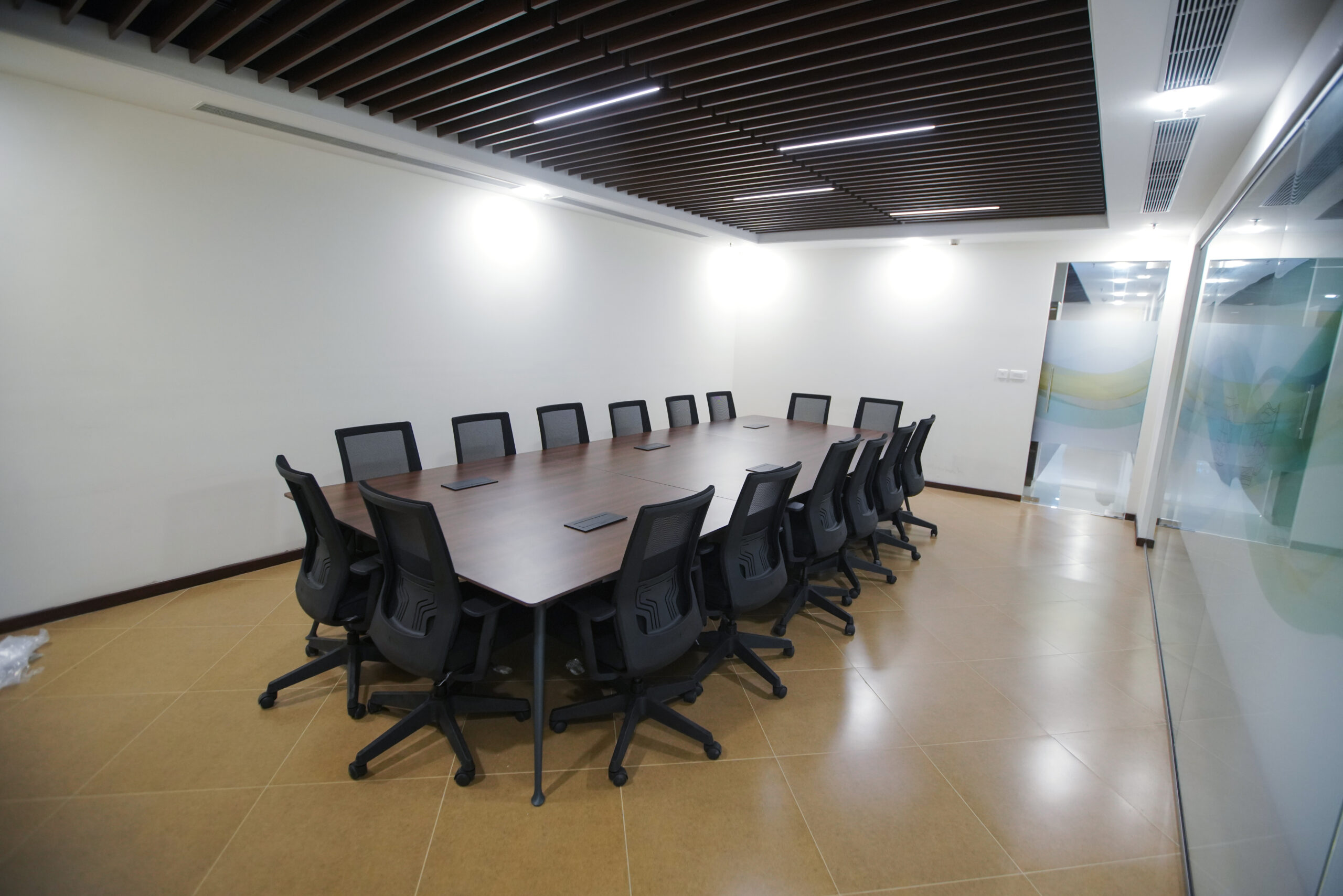 We designed INERG’s corporate office to embody flow, movement, and collaboration. The minimalistic reception features exquisite furniture and a sculptural fin-clad countertop, echoing fluidity. A dynamic baffle ceiling mimics waves, enhancing spatial rhythm. The workstation area integrates biophilic elements, with planter boxes and a hexagonal ceiling resembling a honeycomb—symbolizing unity. Custom in-house furniture fabrication ensures seamless integration. The conference room boasts high-tech support for global meetings. A Kerala-inspired pantry, with tea stall-themed graphics and cargo boat-inspired furniture, adds local character. The cohesive color palette, balancing blues, greens, wood, and white, reinforces harmony and productivity in this meticulously curated workspace.