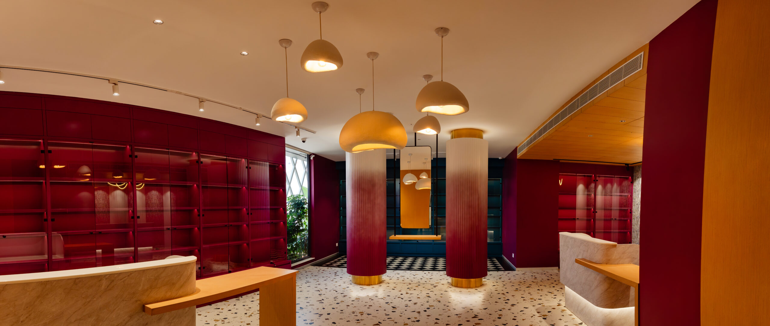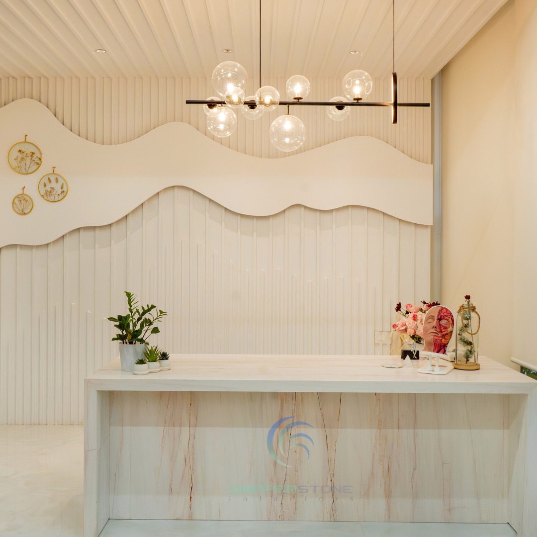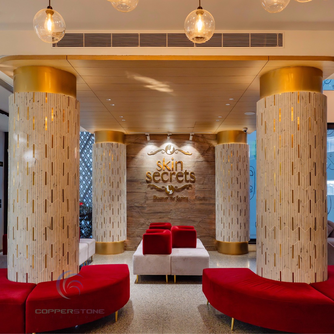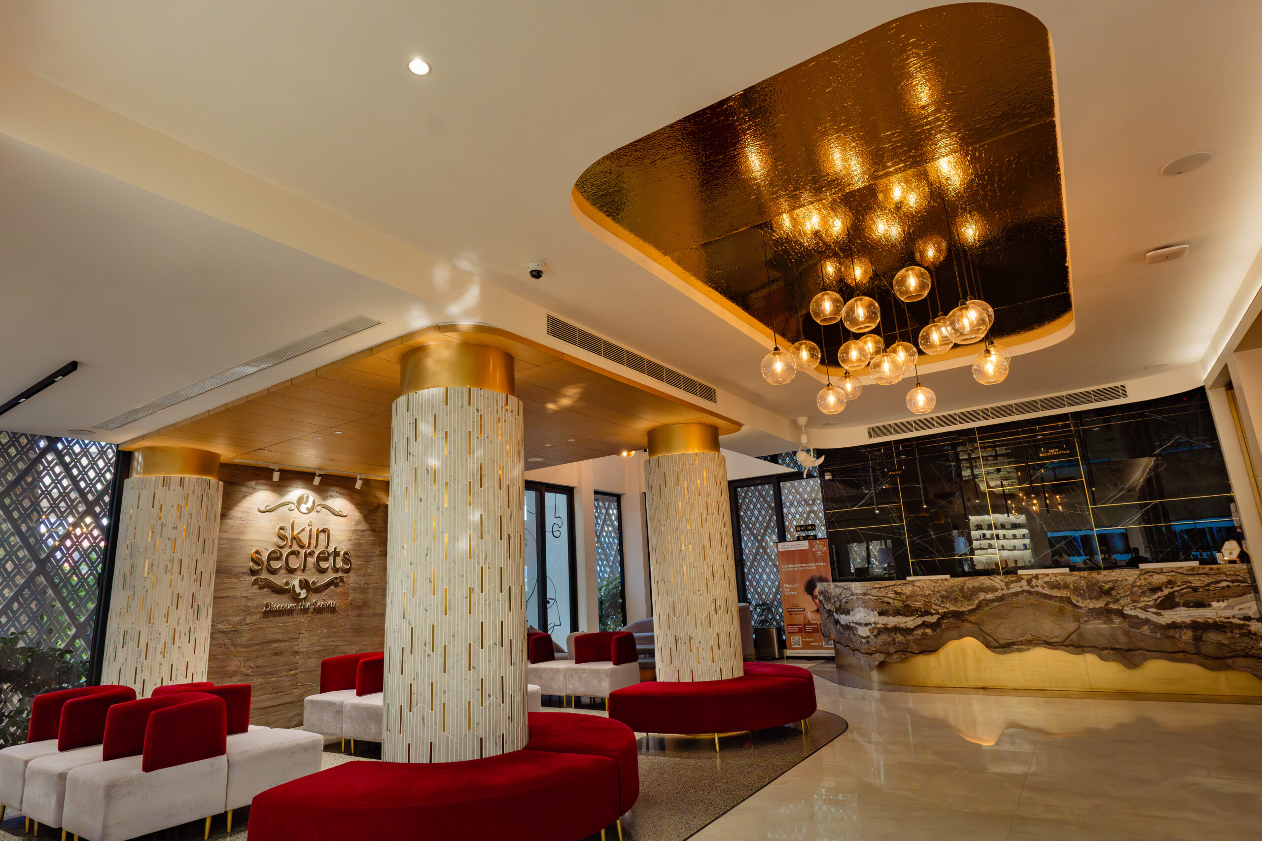 We had the opportunity to implement this milestone project, Skin Secrets, a skincare clinic in Edappally, Kochi, offering high-end dermatology, spa, hair care, and aesthetic treatments. Given its celebrity clientele, the design prioritizes trend-setting aesthetics, bold colors, and immersive interiors, creating an inspiring, lively atmosphere. The clinic’s biophilic architecture integrates natural light, enhancing its vibrant pink-to-white ombre tones, mosaic accents, marble finishes, and checkerboard patterns. The double-height lounge, stunning reception, and high-end pharmacy showcase a blend of elegance and functionality, setting a new standard in contemporary clinic design.