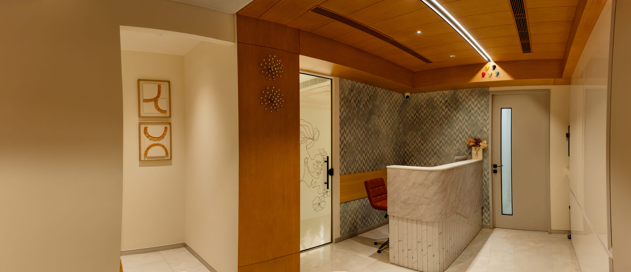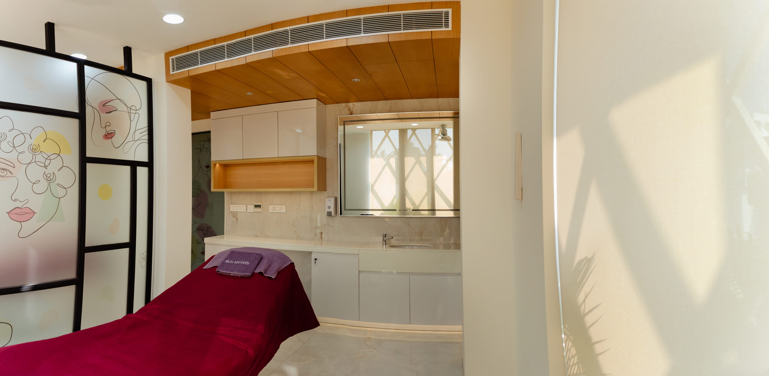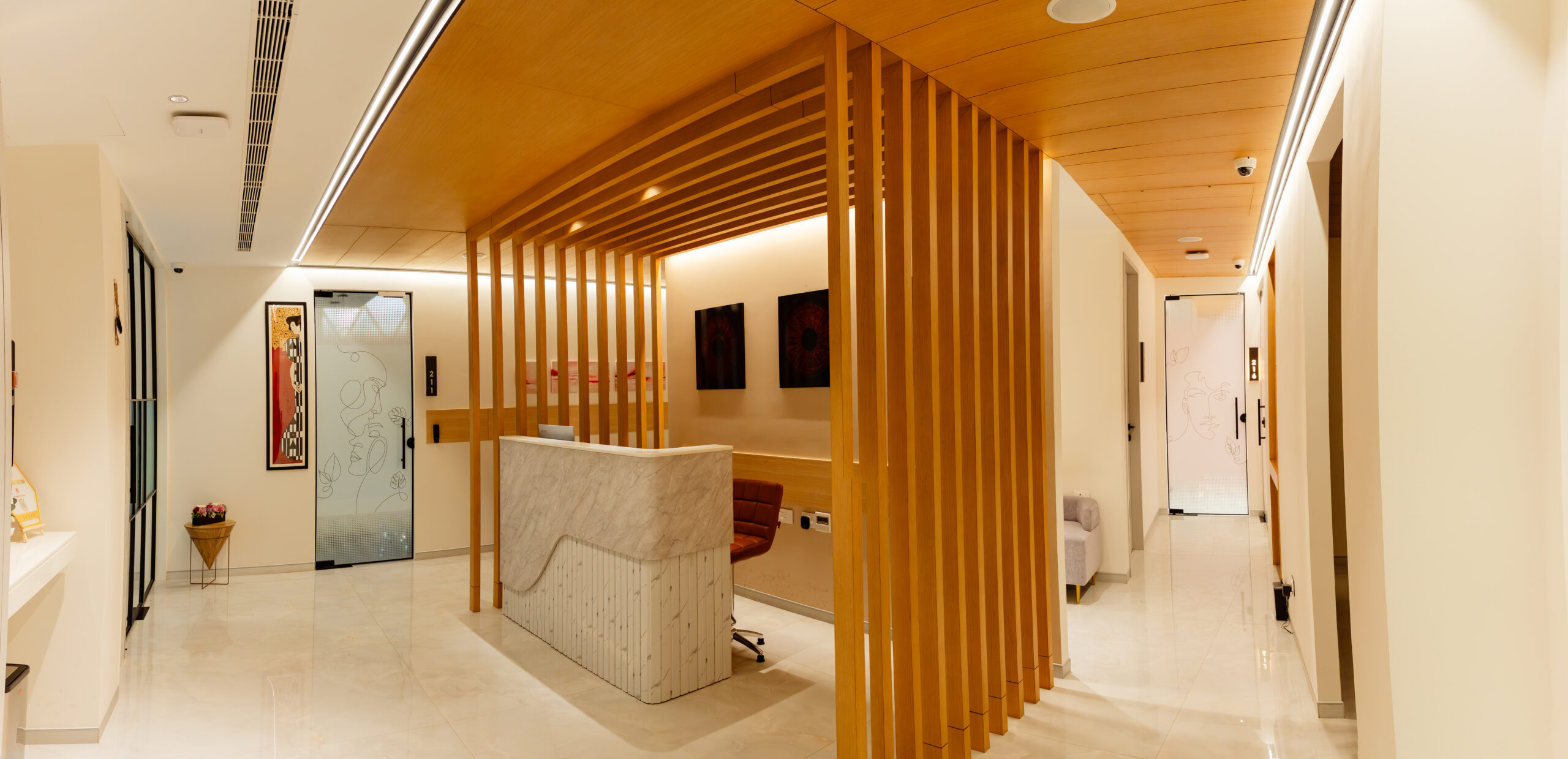 We had the opportunity to implement this milestone project, Skin Secrets, a skincare clinic in Edappally, Kochi, offering high-end dermatology, spa, hair care, and aesthetic treatments. Given its celebrity clientele, the design prioritizes trend-setting aesthetics, bold colors, and immersive interiors, creating an inspiring, lively atmosphere. The clinic’s biophilic architecture integrates natural light, enhancing its vibrant pink-to-white ombre tones, mosaic accents, marble finishes, and checkerboard patterns. The double-height lounge, stunning reception, and high-end pharmacy showcase a blend of elegance and functionality, setting a new standard in contemporary clinic design.