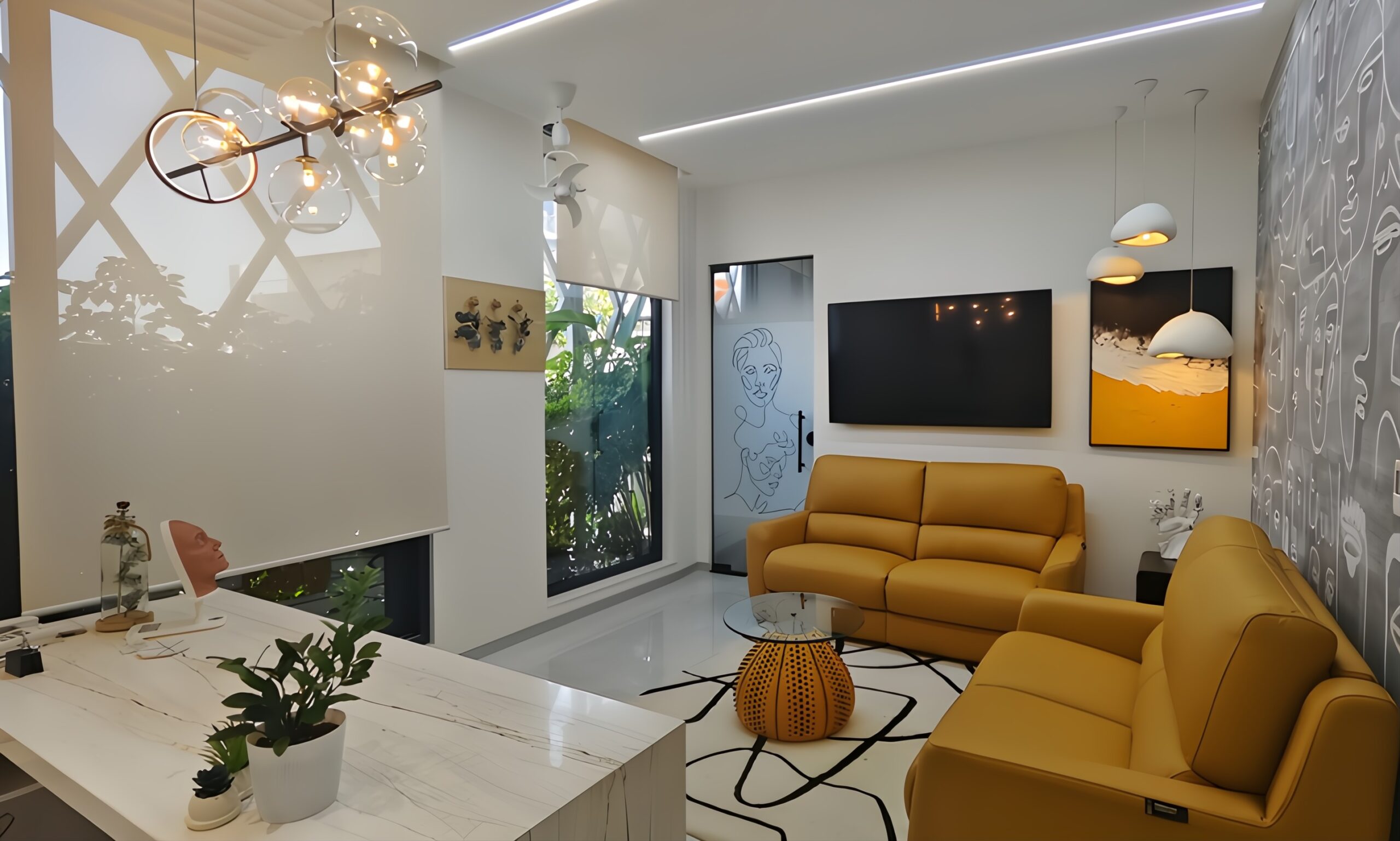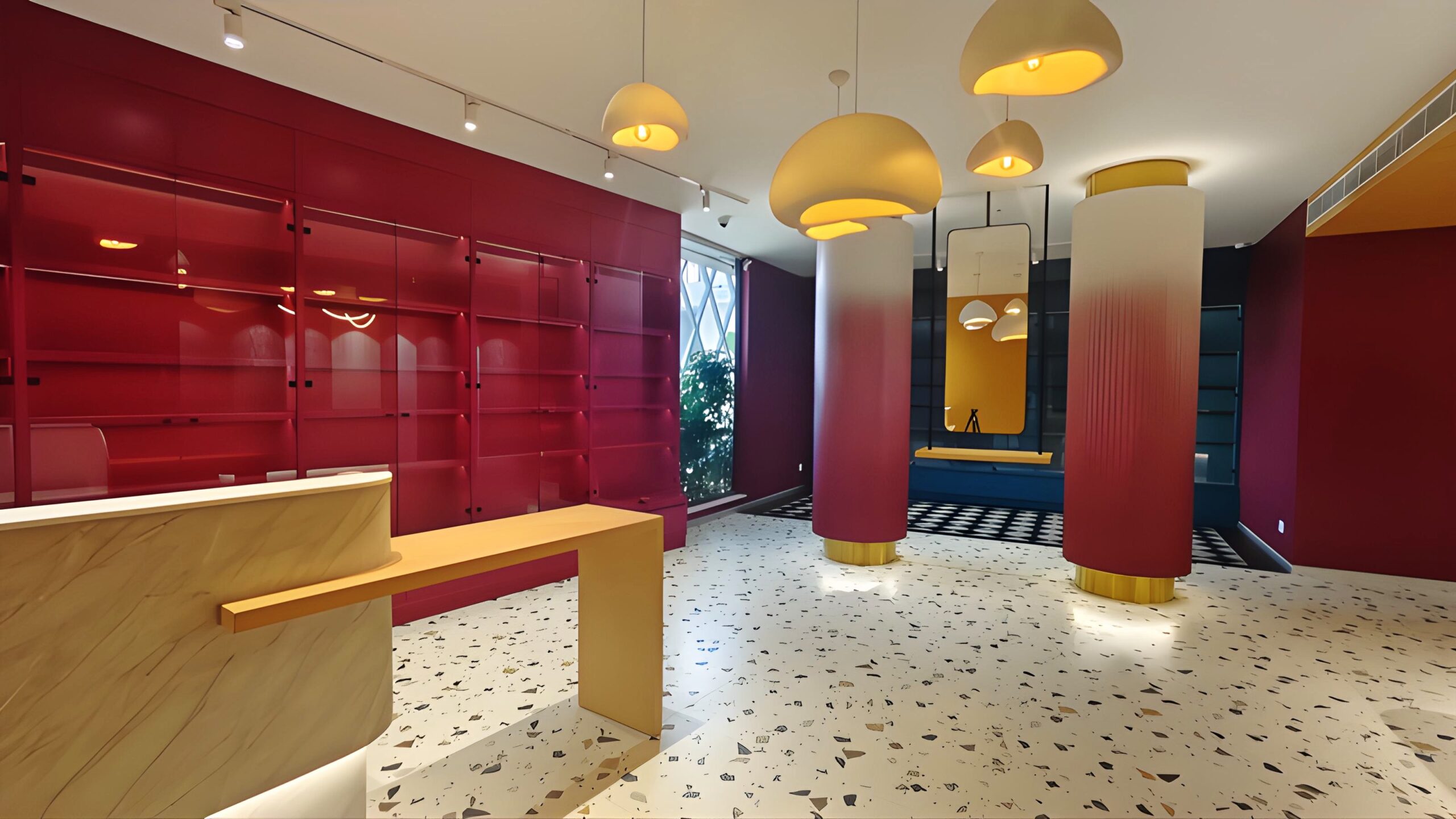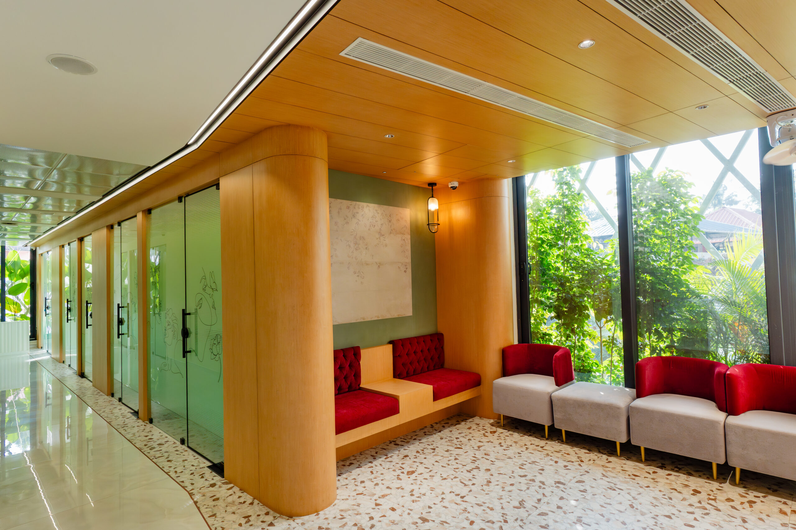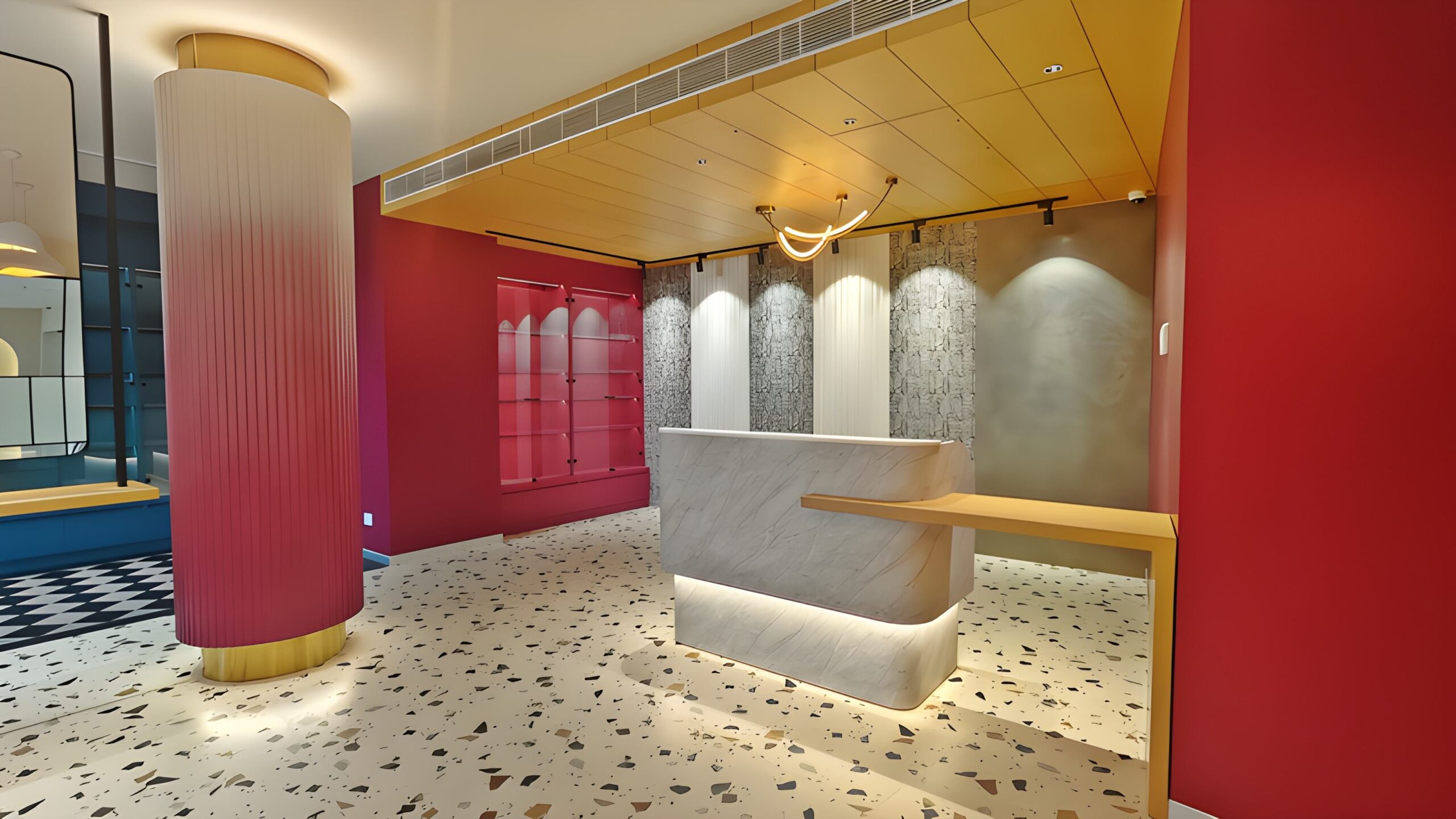 We had the opportunity to implement this milestone project, Skin Secrets, a skincare clinic in Edappally, Kochi, offering high-end dermatology, spa, hair care, and aesthetic treatments. Given its celebrity clientele, the design prioritizes trend-setting aesthetics, bold colors, and immersive interiors, creating an inspiring, lively atmosphere. The clinic’s biophilic architecture integrates natural light, enhancing its vibrant pink-to-white ombre tones, mosaic accents, marble finishes, and checkerboard patterns. The double-height lounge, stunning reception, and high-end pharmacy showcase a blend of elegance and functionality, setting a new standard in contemporary clinic design.
