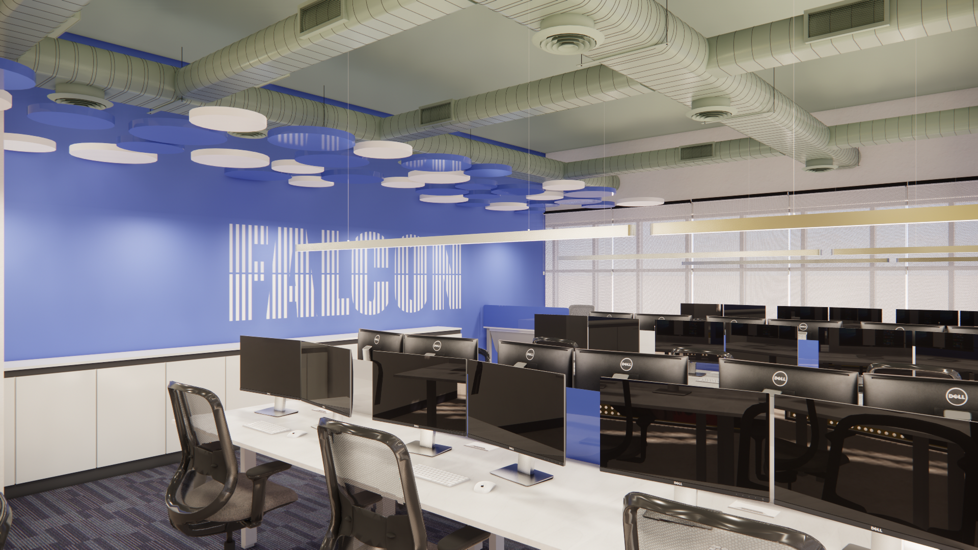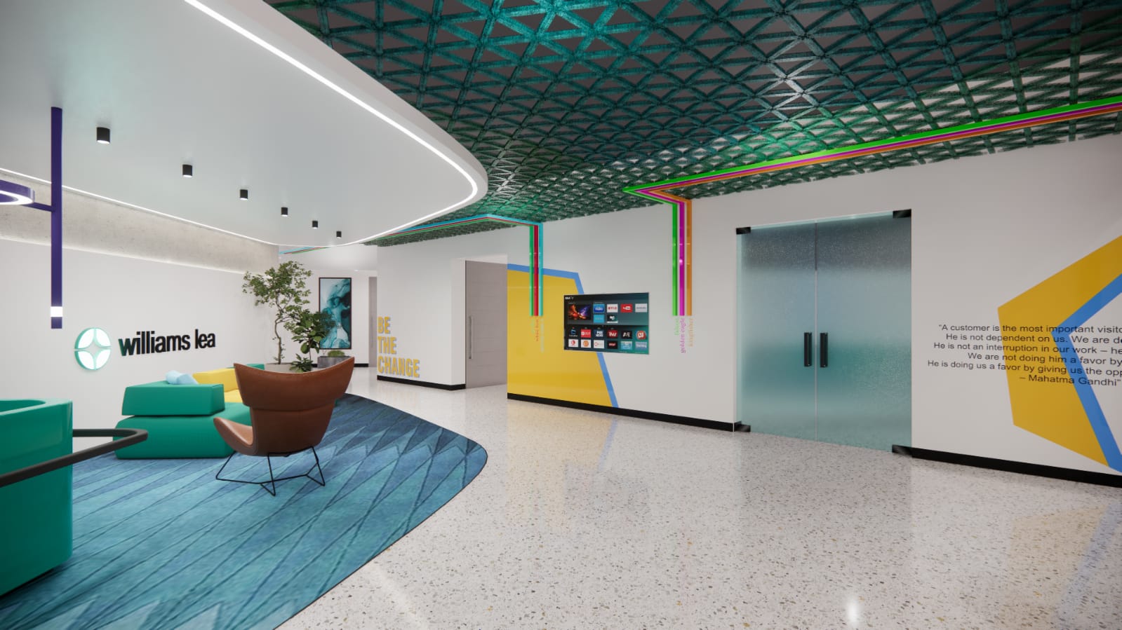 A restrained material palette of exposed concrete, fluted surfaces, muted blues and greens, warm wood, and soft upholstery balances industrial character with comfort. Lighting and acoustics are carefully integrated to define zones without enclosure, allowing the space to remain adaptable and intuitive.
